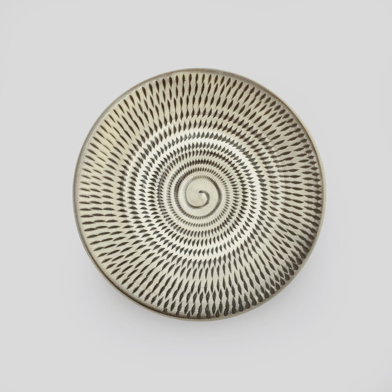 小鹿田焼はお皿等を複数枚重ねて焼きます。その際、重なった部分がくっついてしまわないよう、釉薬を剥がした跡が白い円(目剥ぎ)となって現れます。一番上で焼かれたものは目剥ぎがありません。目剥ぎは、兄弟窯の小石原焼にはなく、小鹿田焼の特徴のひとつでもあります。ご注文の際は目剥ぎの有無をご指定いただけません。ご了承ください。