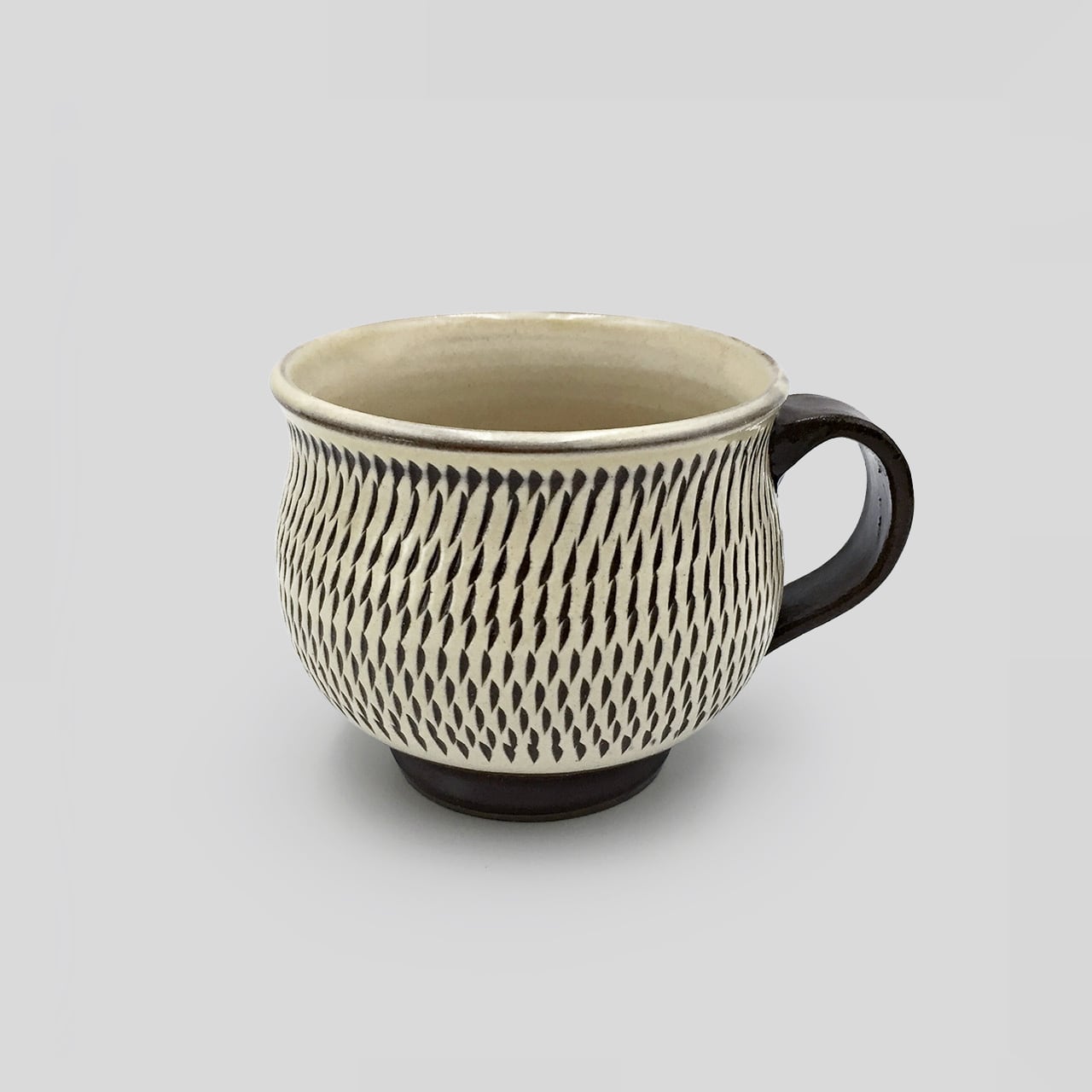 器の外側に小鹿田焼の伝統技法である「飛び鉋(かんな)」を施しています。弾力性のある金属で作った鉋を使用し、細かい連続的な削り目をつけ模様をつける技法です。