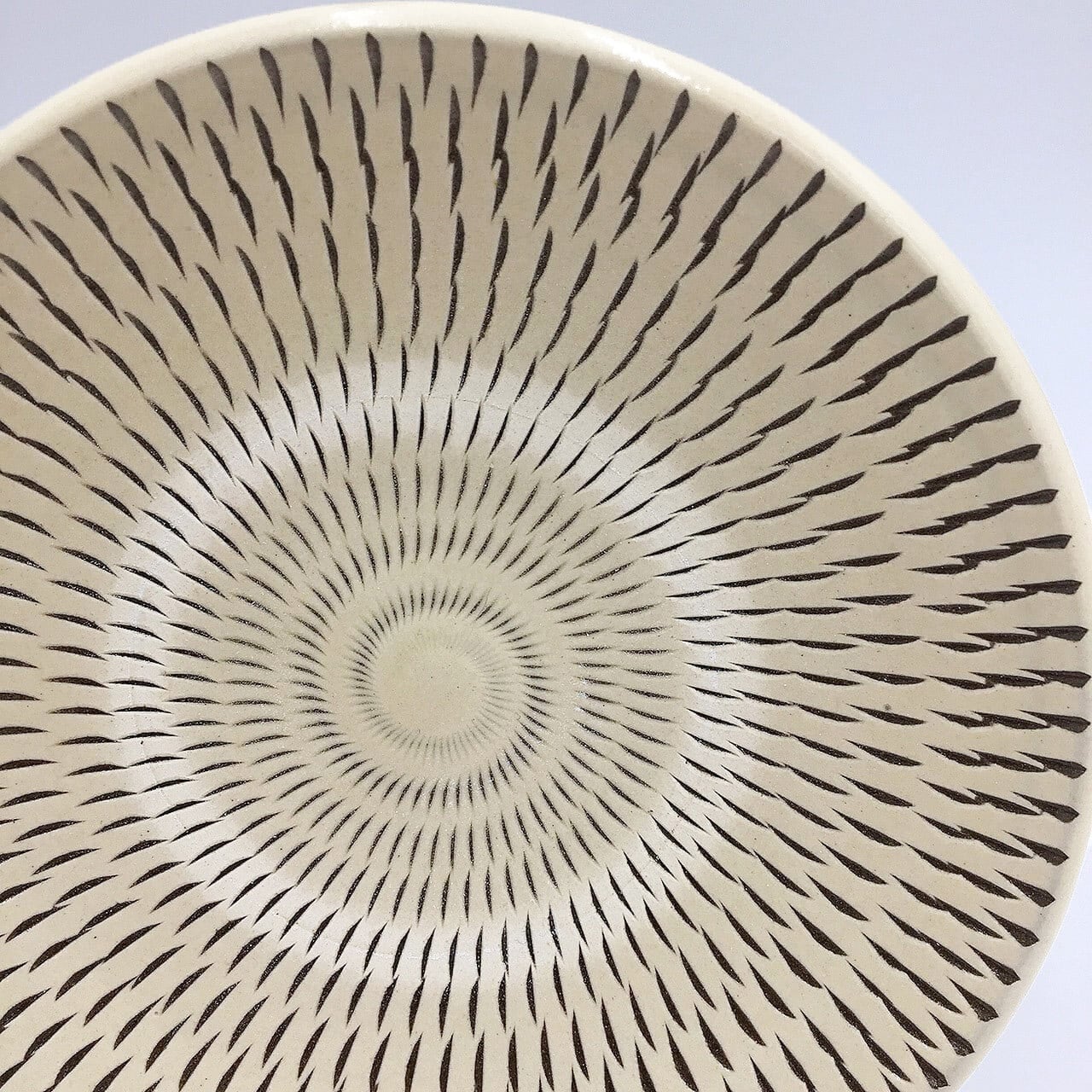 器の内側に小鹿田焼の伝統技法である「飛び鉋(かんな)」を施しています。弾力性のある金属で作った鉋を使用し、細かい連続的な削り目をつけ模様をつける技法です。
