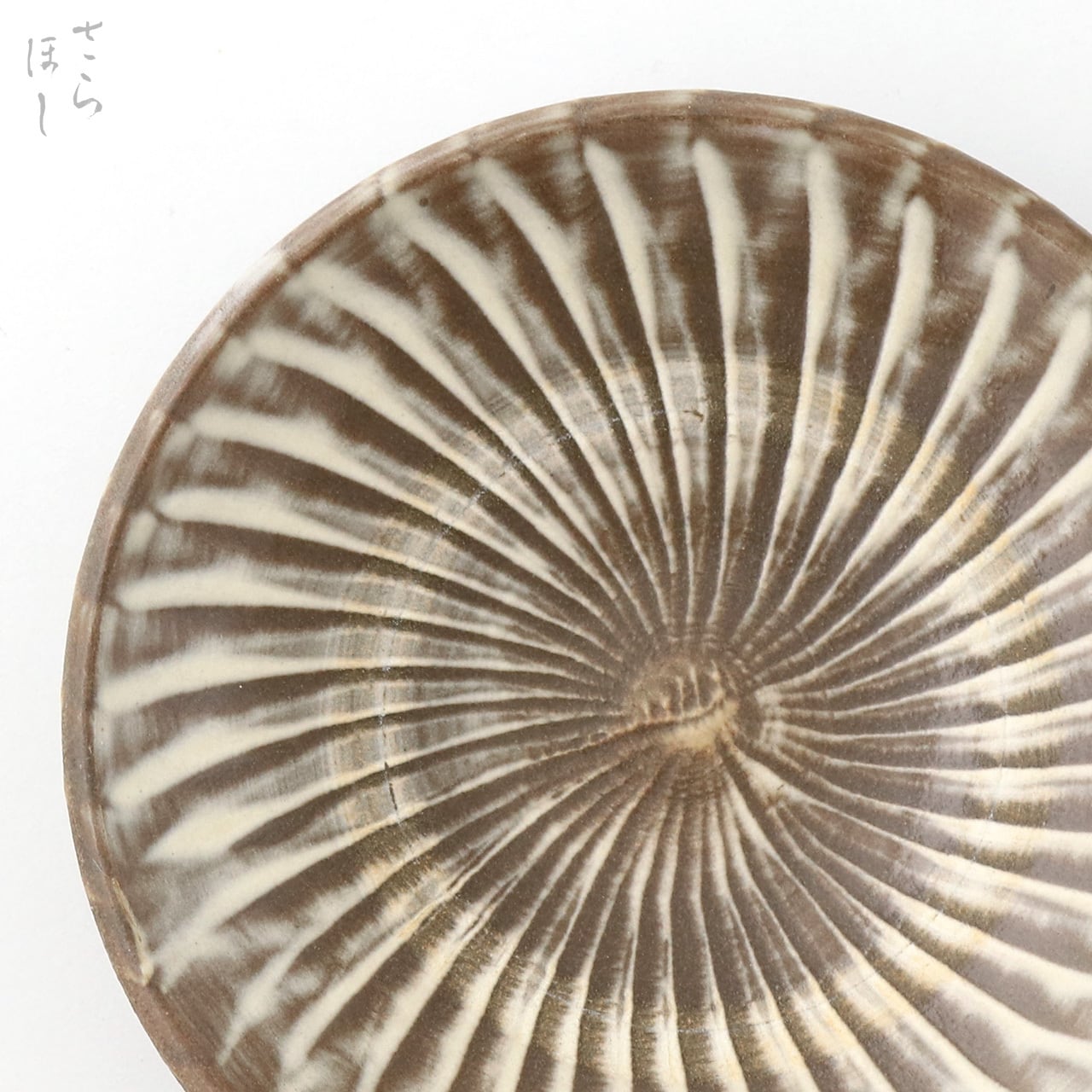 器の内側に小鹿田焼の伝統技法である「打ち刷毛目(はけめ)」を施しています。器に白化粧土を掛け、蹴轆轤を蹴って回しながら刷毛を打ち付けて連続的な模様をつける技法です。手作りならではの温かみと独特の風合いが楽しめます。