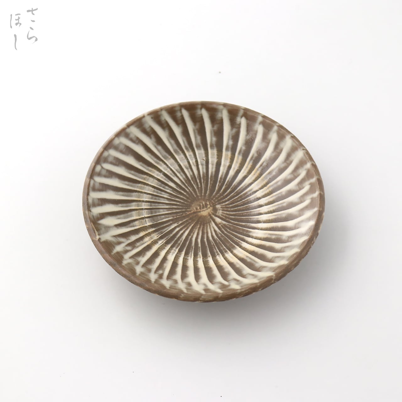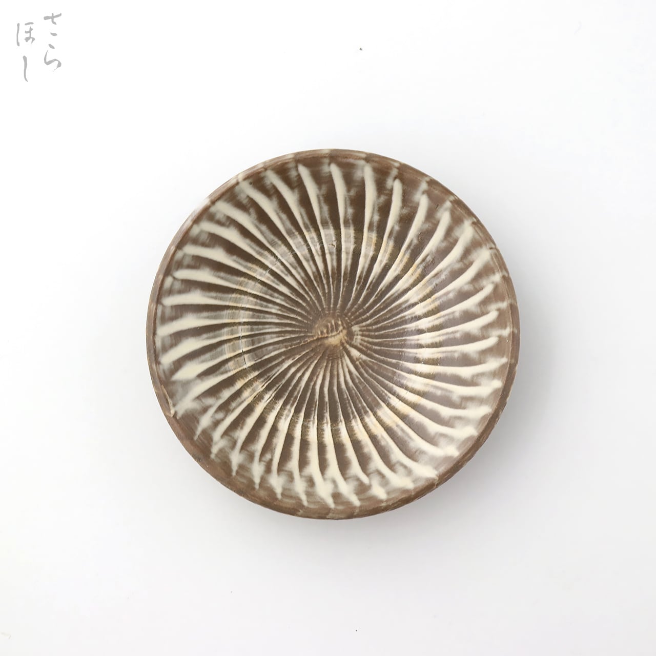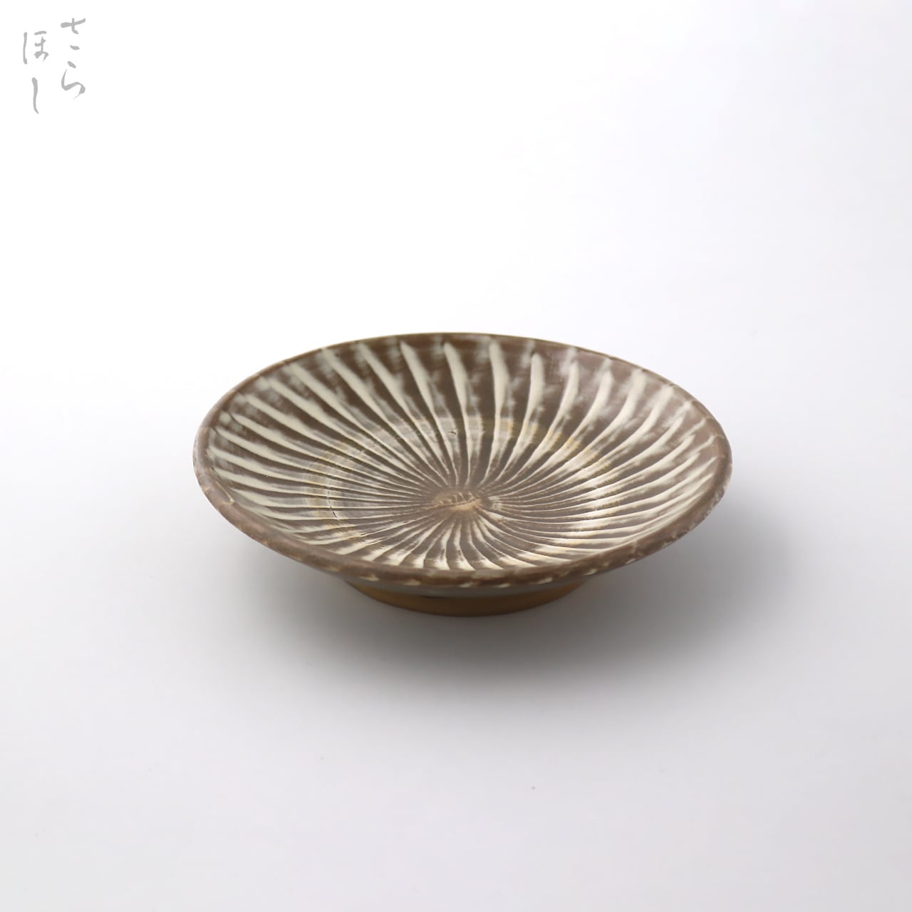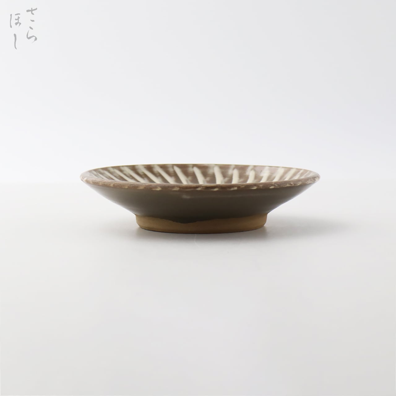小鹿田焼(おんたやき)の打ち刷毛目4寸5分平皿です。化粧土の白、素地の薄茶の淡い色合いが美しく、品のある優しい色に焼き上がりました。