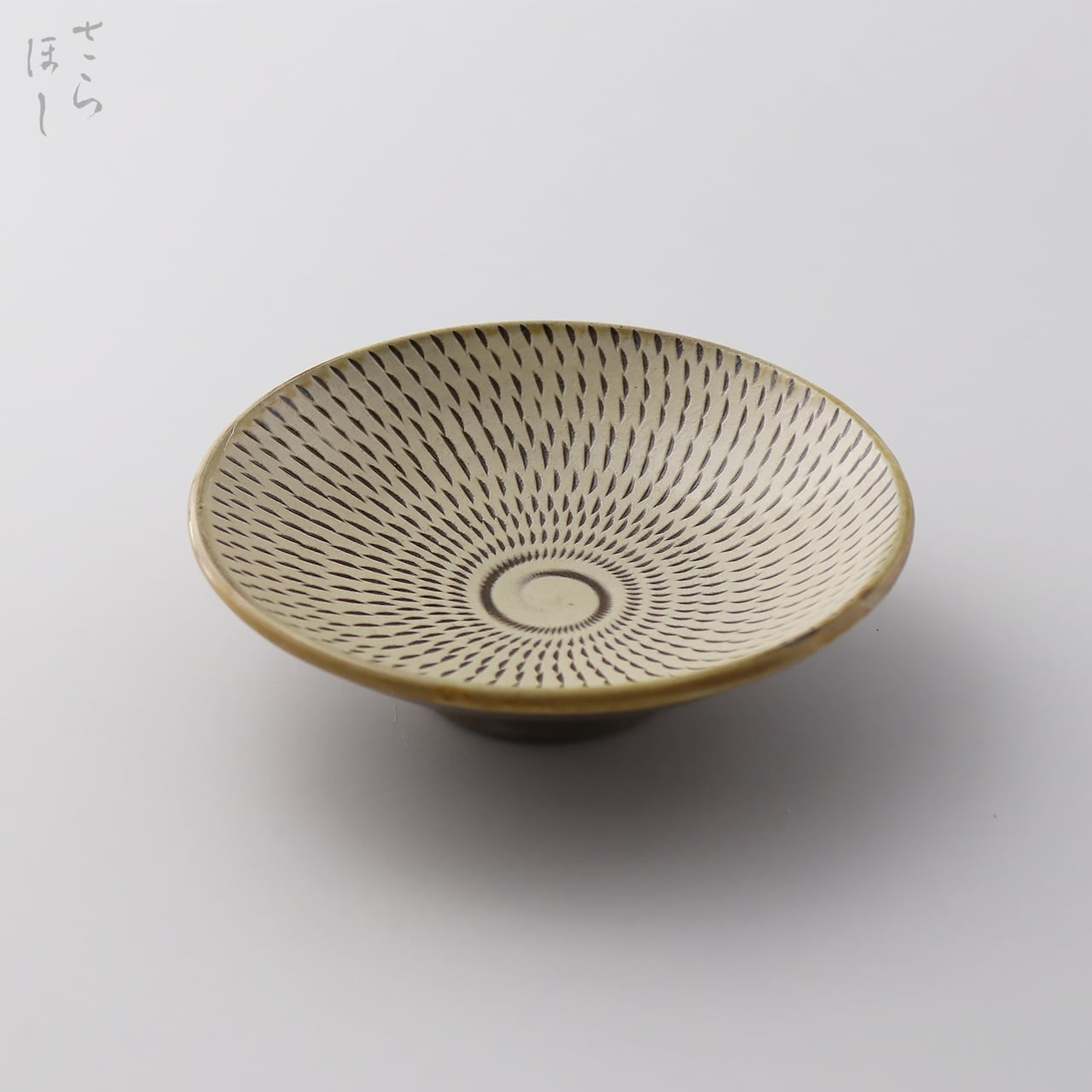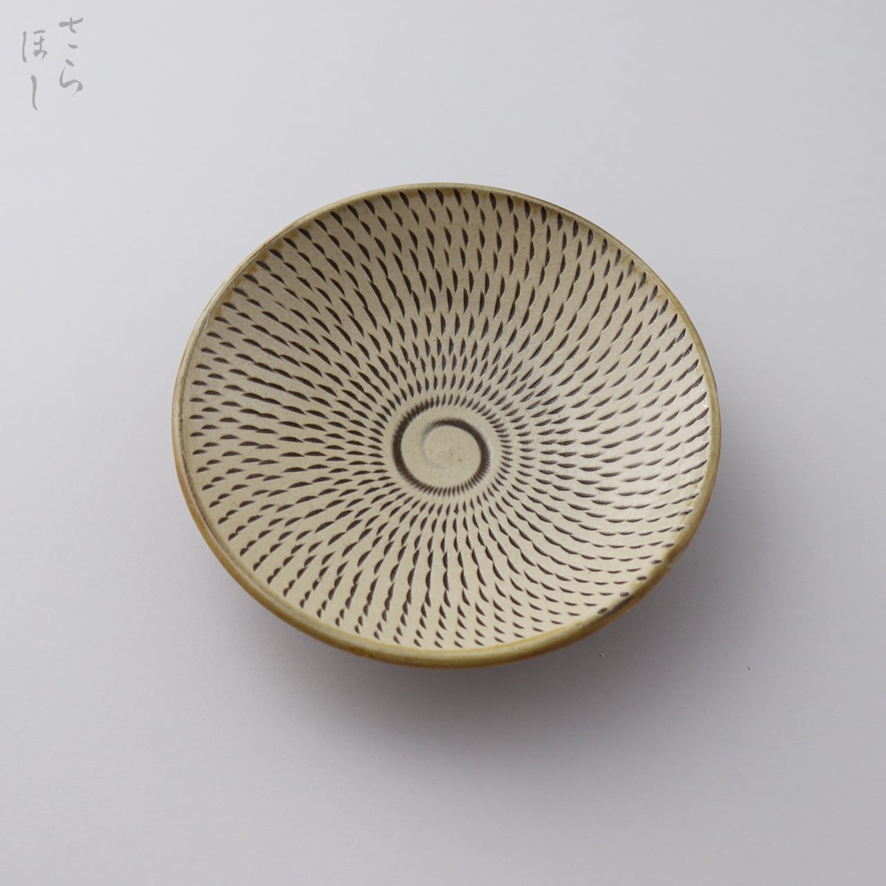 器の内側に小鹿田焼の伝統技法である「飛び鉋(かんな)」を施しています。弾力性のある金属で作った鉋を使用し、細かい連続的な削り目をつけ模様をつける技法です。