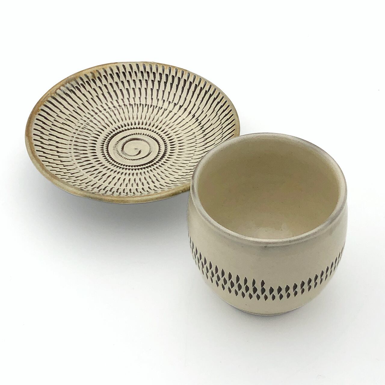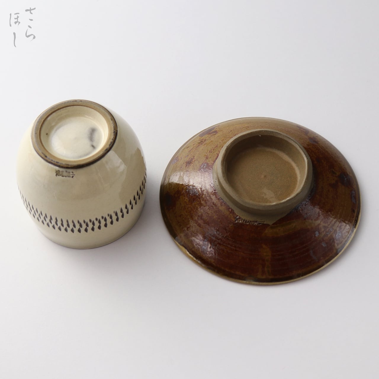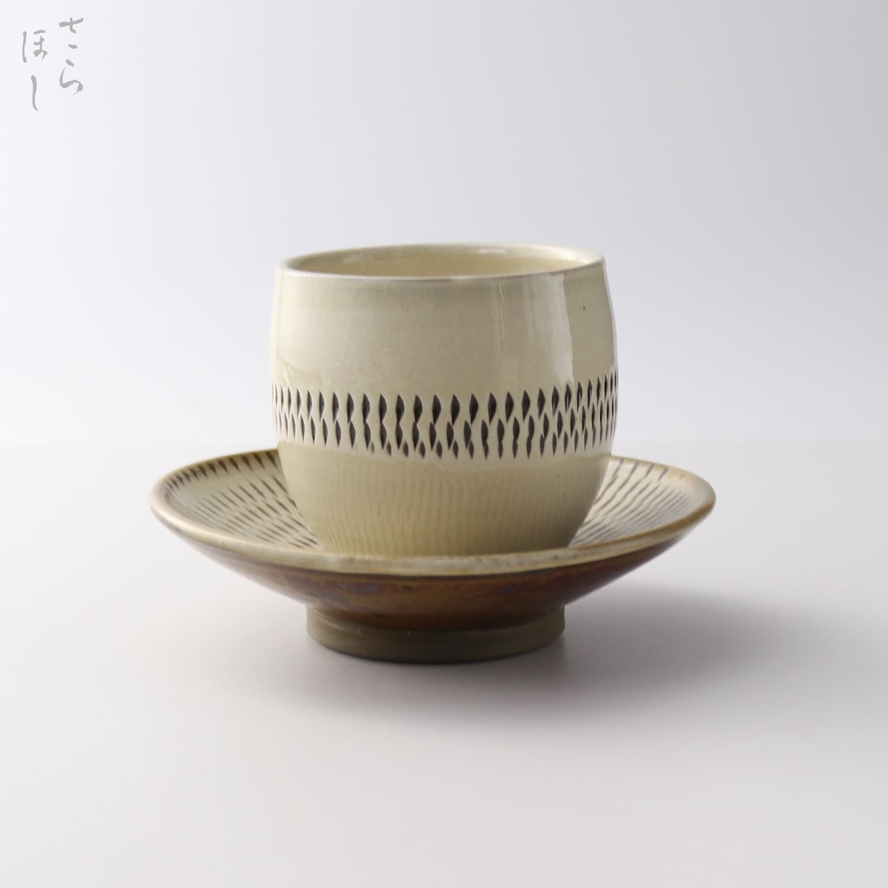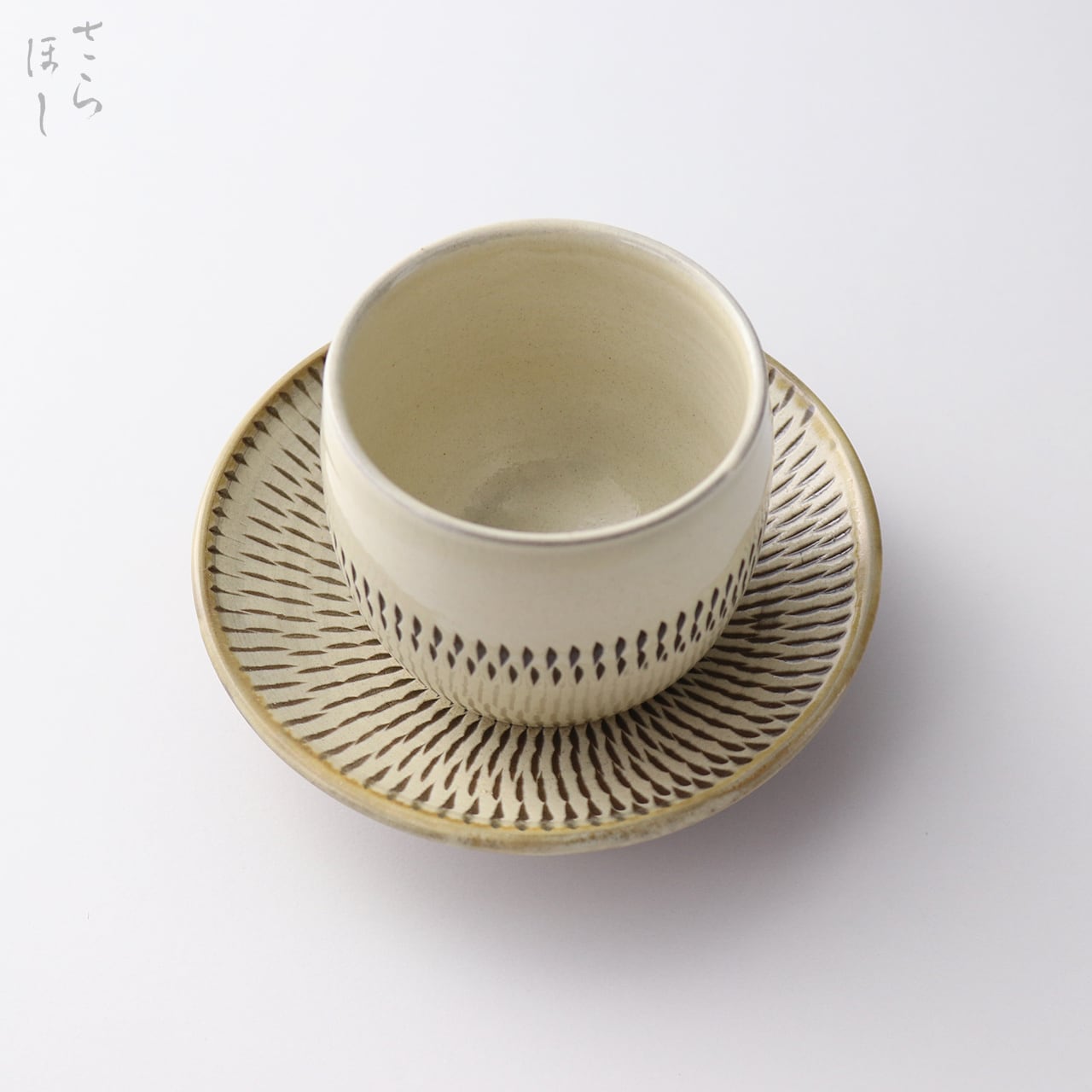 カップは器の外側中央に、お皿は内側に小鹿田焼の伝統技法である「飛び鉋(かんな)」を施しています。弾力性のある金属で作った鉋を使用し、細かい連続的な削り目をつけ模様をつける技法です。