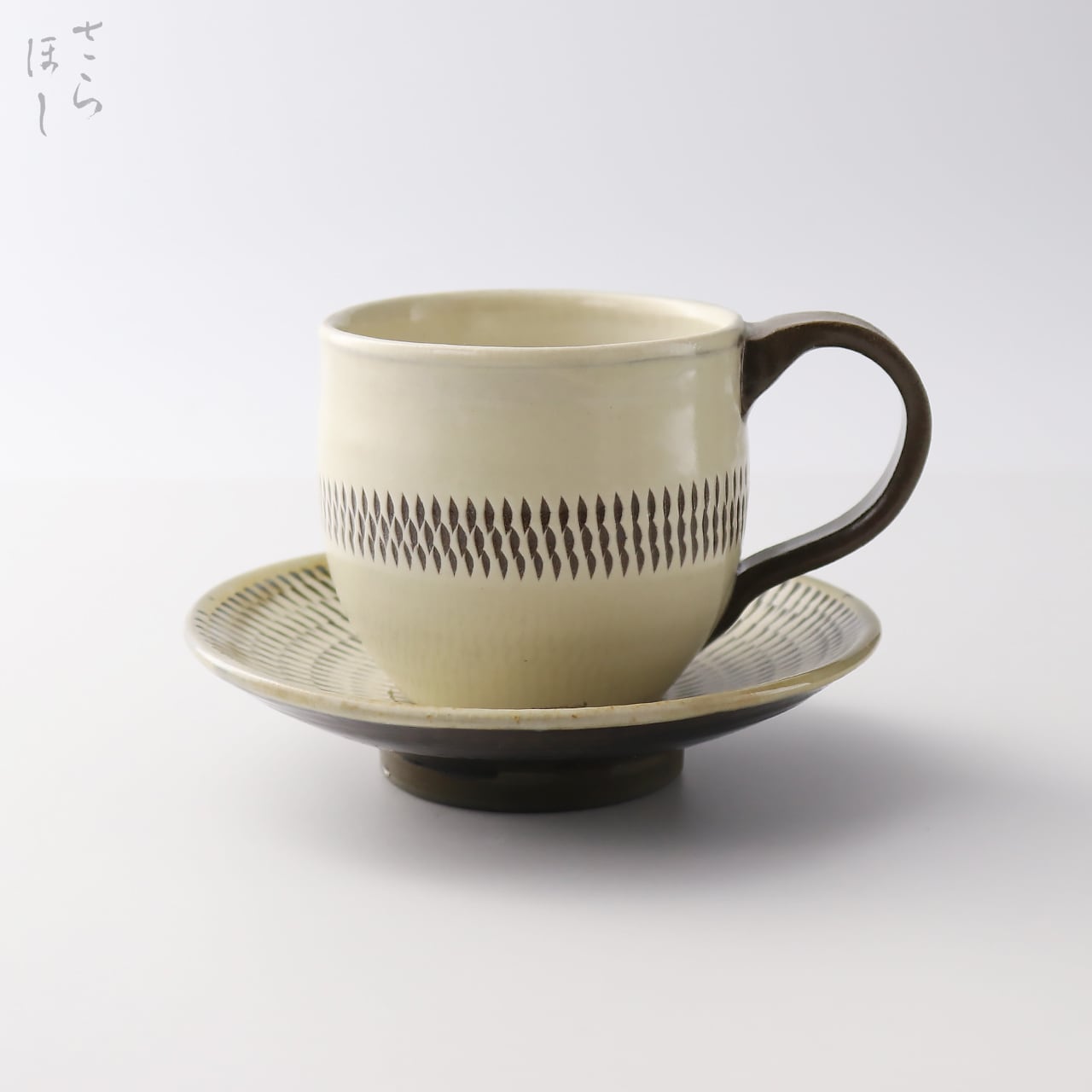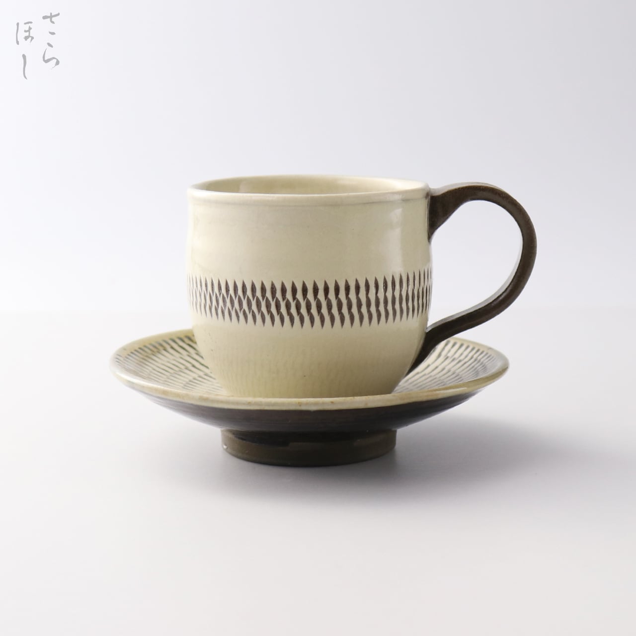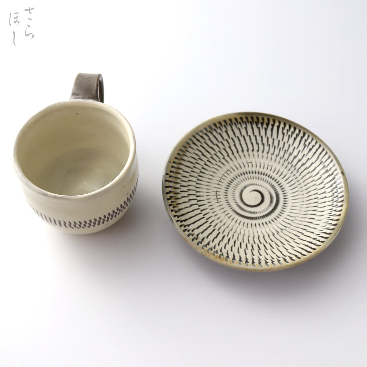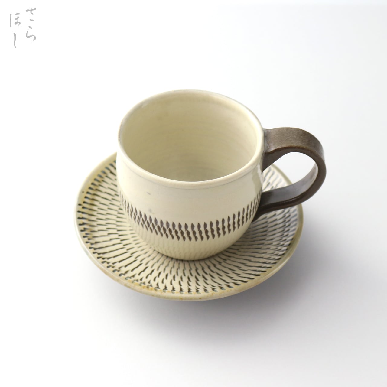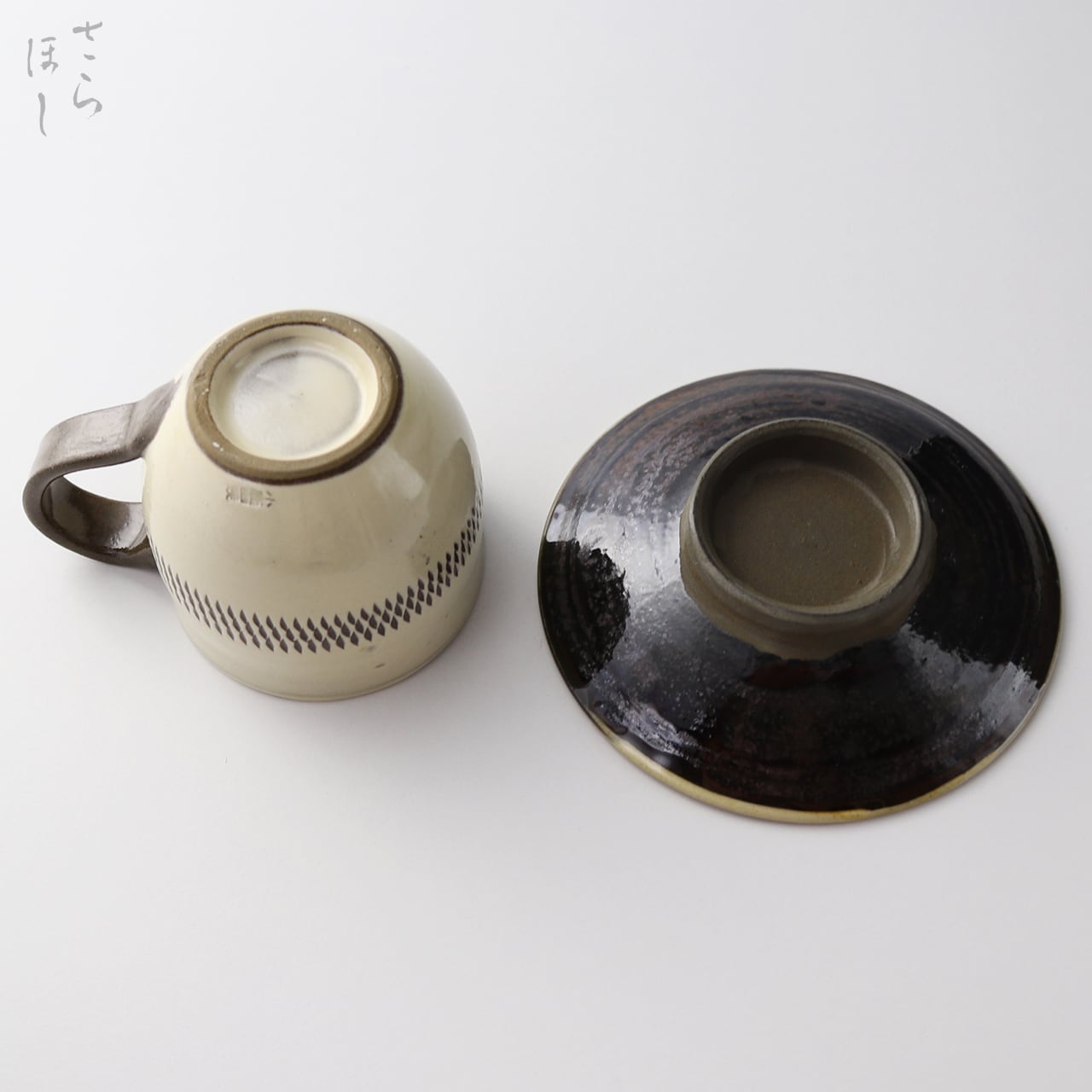 カップは器の外側中央に、お皿は内側に小鹿田焼の伝統技法である「飛び鉋(かんな)」を施しています。弾力性のある金属で作った鉋を使用し、細かい連続的な削り目をつけ模様をつける技法です。