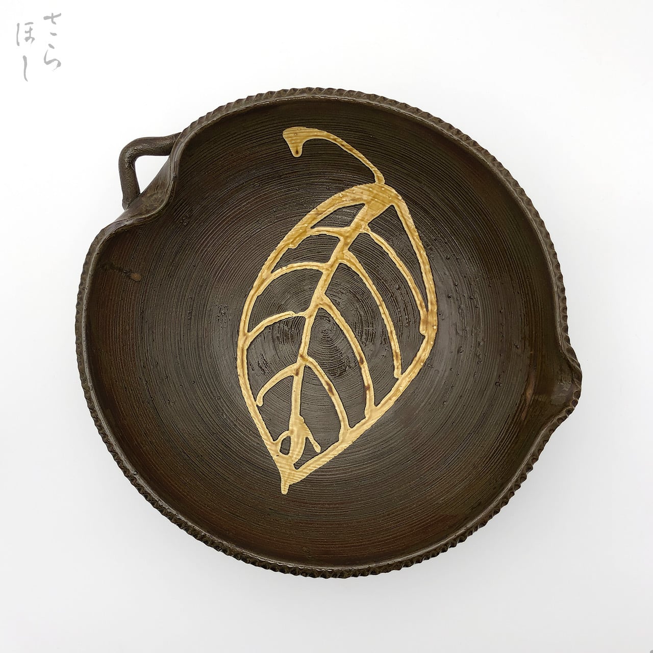 器の内外にイッチンで大らかで遊び心のある文様が大胆に描かれています。イッチン描きは小鹿田ではポン描きといわれ、スポイトのような道具に化粧土を入れ、口から絞り出して素地に盛るように立体的な文様を描いていく技法です。外側には伝統的な波線を描き、見込みには櫛で描いた線上にダイナミックに木の葉が描かれています。口縁にはヘラを布で包み、轆轤を回転させながら連続的に押し当てることで凹凸を付けています。