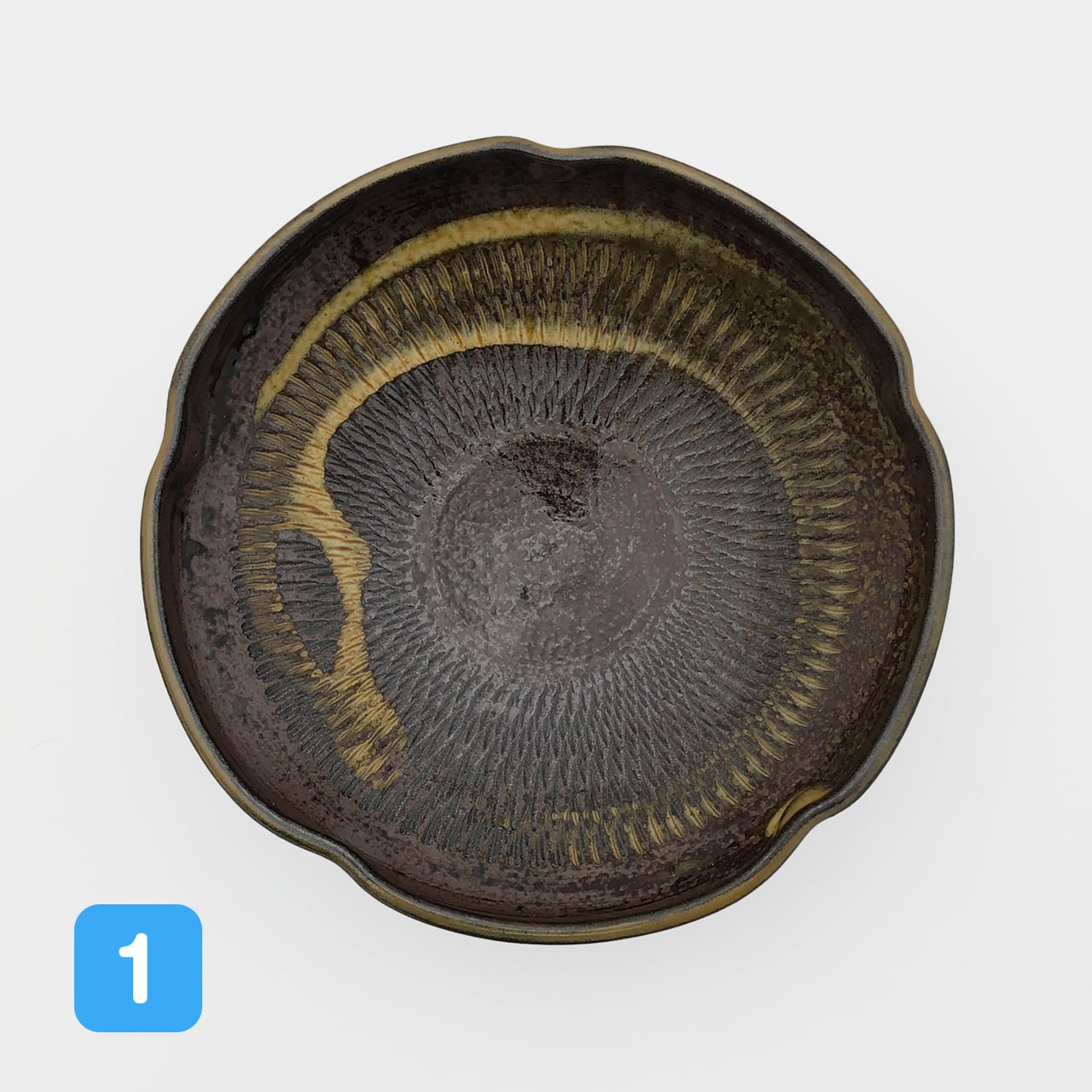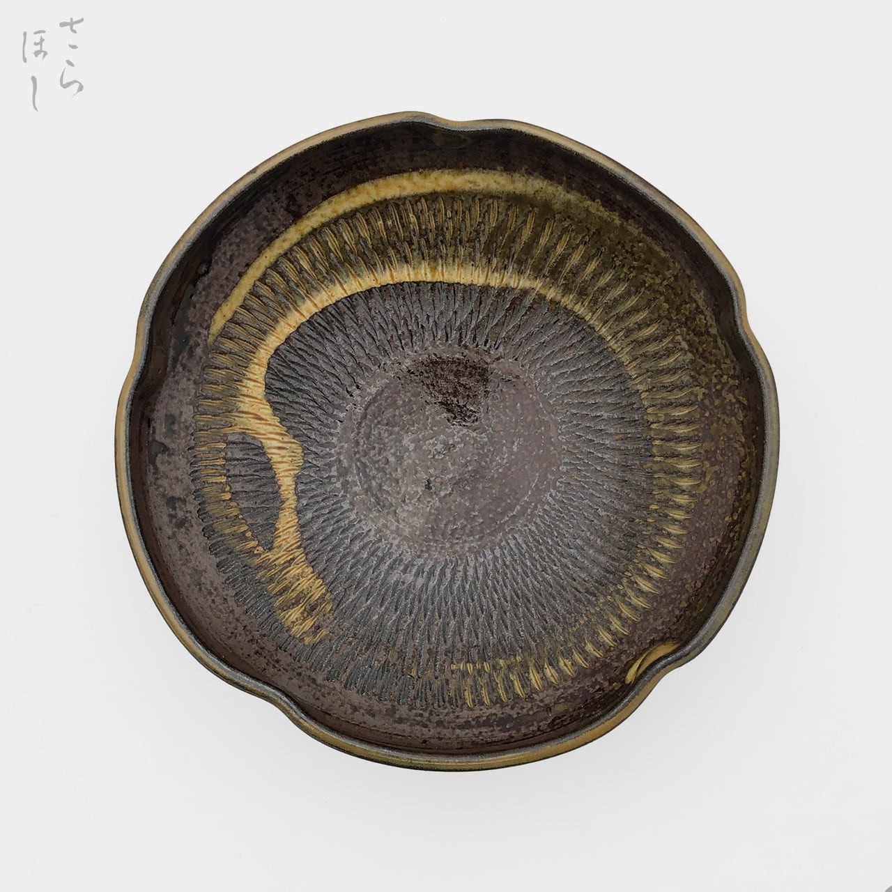 小鹿田焼 小袋窯 7寸梅鉢 地飛びかんな/掛け流し 茶 幅約21cm 陶器 和食器 民藝