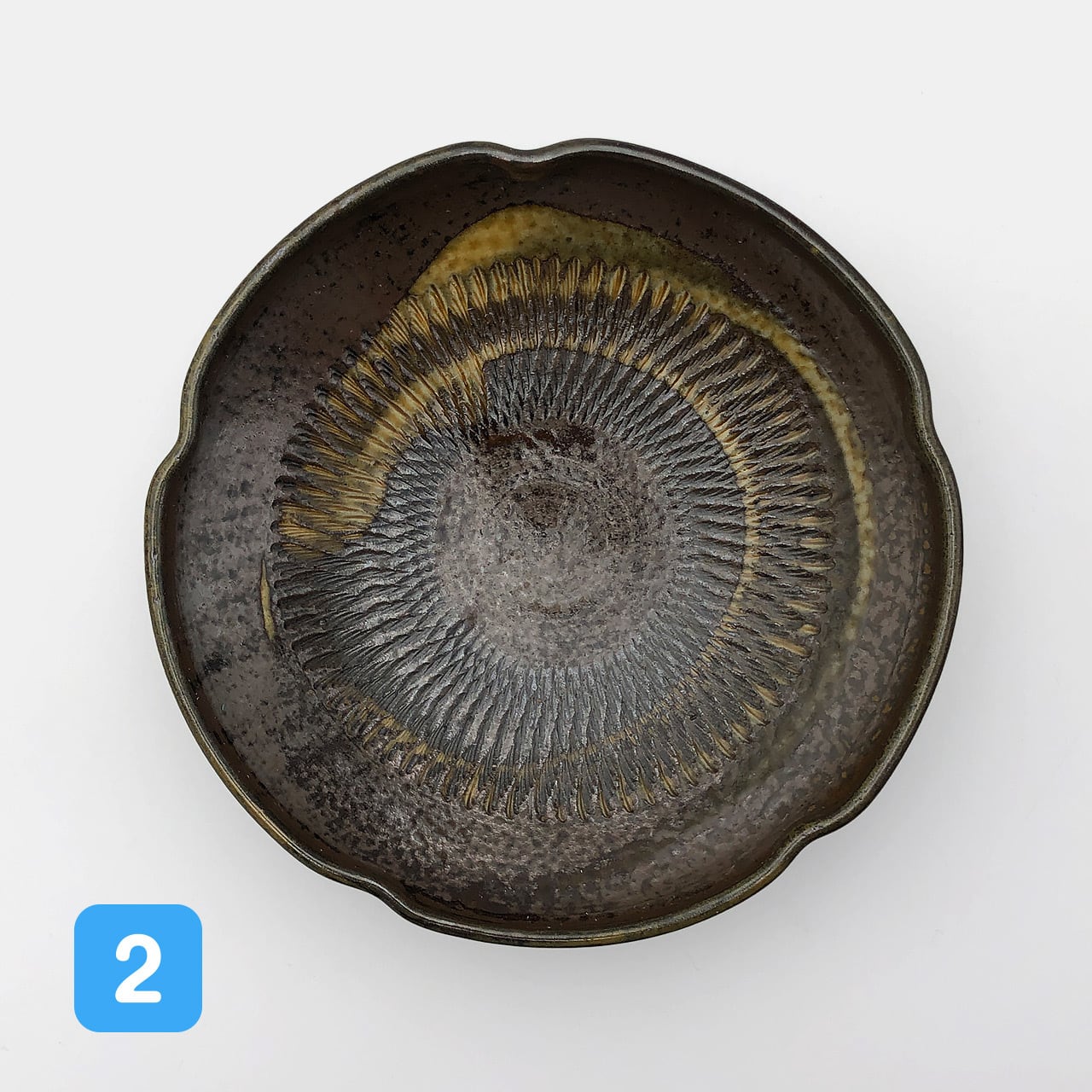 縁部分で梅の花をかたどった趣のある器です。器の内外に素地の段階で小鹿田焼の伝統技法である「飛び鉋(かんな)を施しています。飛び鉋は、弾力性のある金属で作った鉋を使用し、細かい連続的な削り目をつけ模様をつける技法です。さらに、器の内外に刷毛で化粧土を塗り、即興的な模様を描いています。化粧土が塗られた部分は鉋が浮かび上がって奥深い印象的な景色になっています。また、化粧土の濃淡やかすれ具合は一つひとつ異なります。