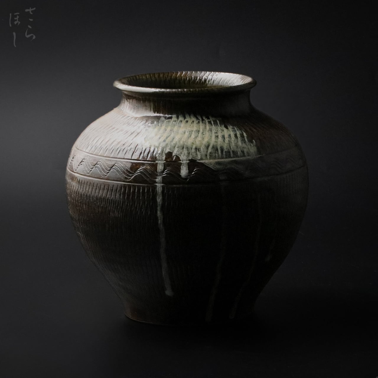 直径が約18.5cm、高さ約20cmの丸花瓶で、器の外側全面に小鹿田焼の伝統技法である「飛び鉋(かんな)」を施しています。飛び鉋は、弾力性のある金属で作った鉋を使用し、細かい連続的な削り目をつけ模様をつける技法です。さらに、中段付近に木材で波線を描く「櫛描き」を加えてアクセントを付けています。また、前後に白釉を打ち掛け、即興的な模様を描いています。