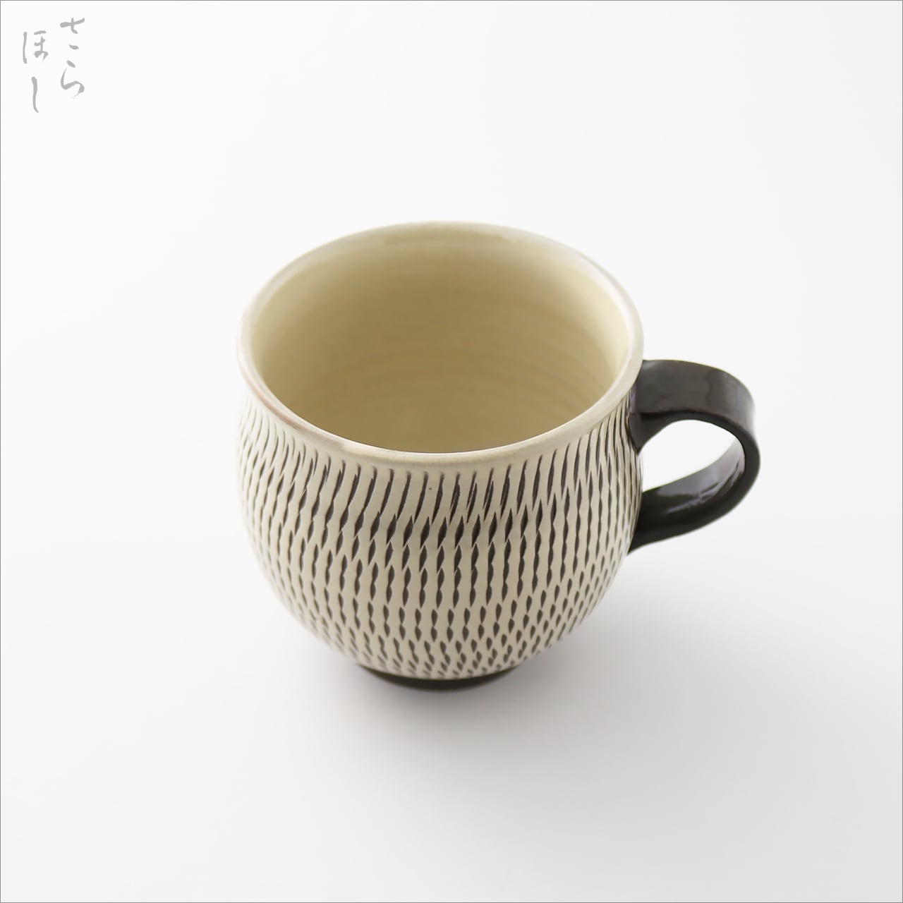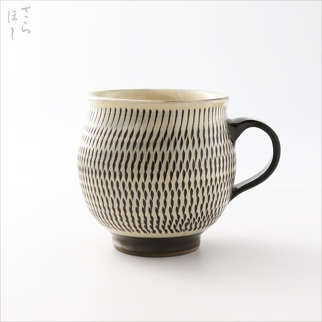 器の外側に小鹿田焼の伝統技法である「飛び鉋(かんな)」を施しています。弾力性のある金属で作った鉋を使用し、細かい連続的な削り目をつけ模様をつける技法です。