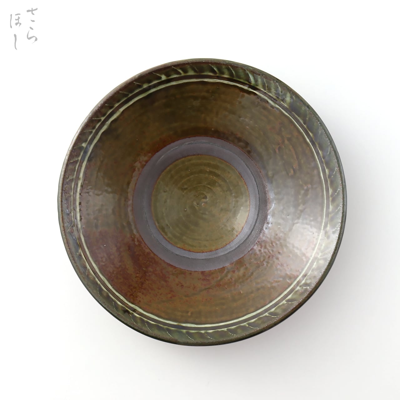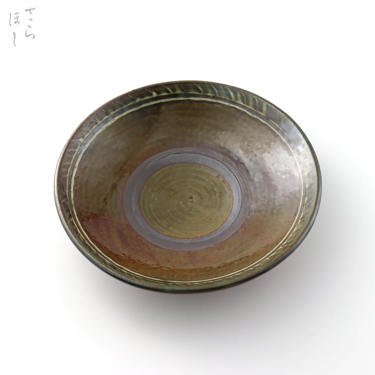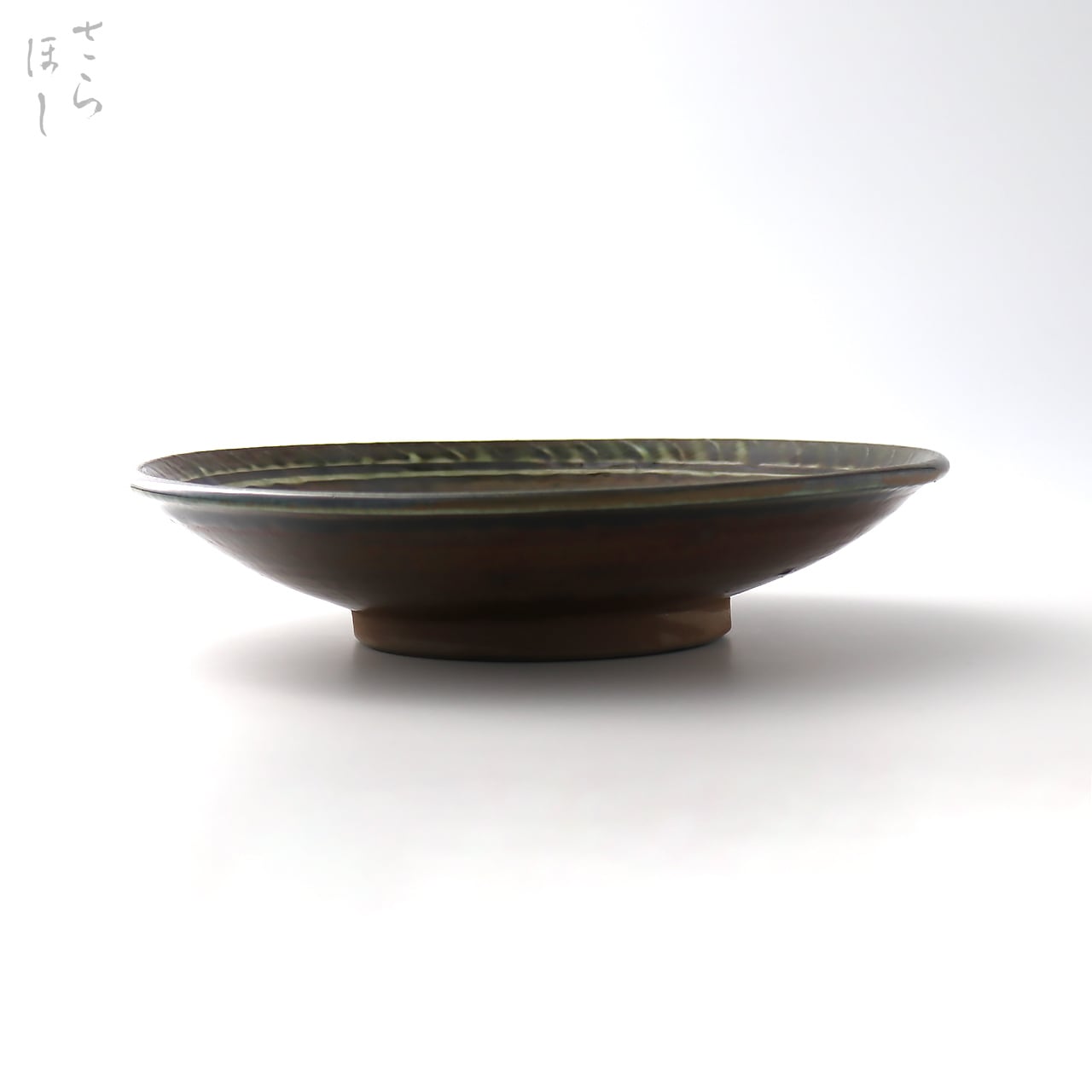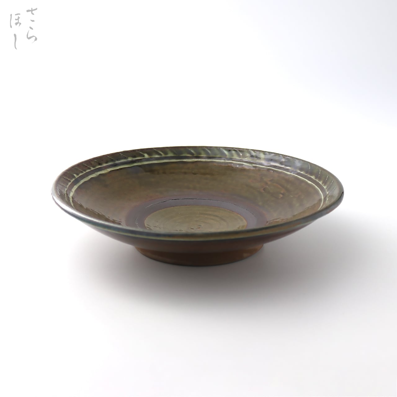 成形後、ふちに打ち刷毛目でアクセントを付け、釉薬を掛けて登り窯で焼いています。奥行のある美しい色合い、表情に仕上がっています。