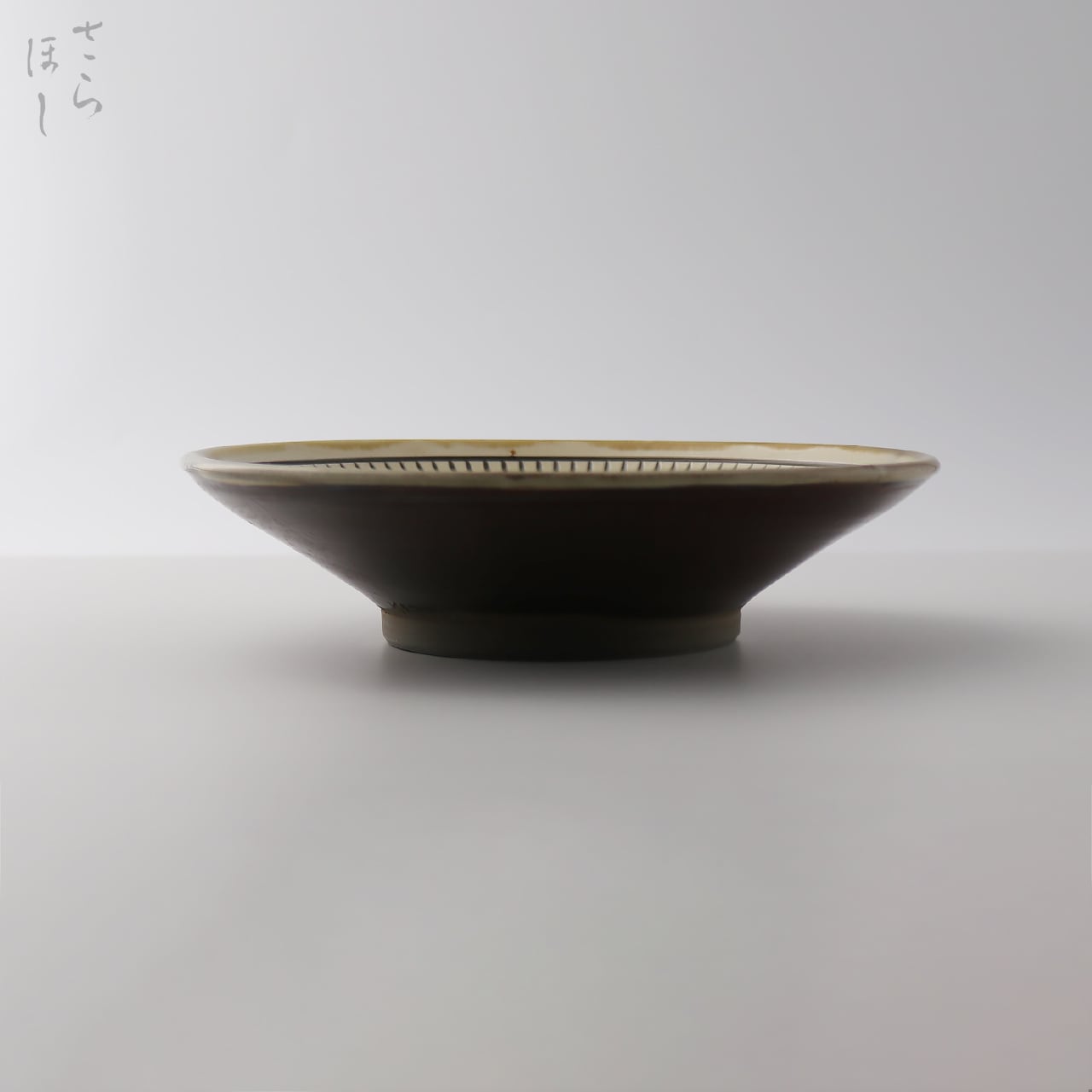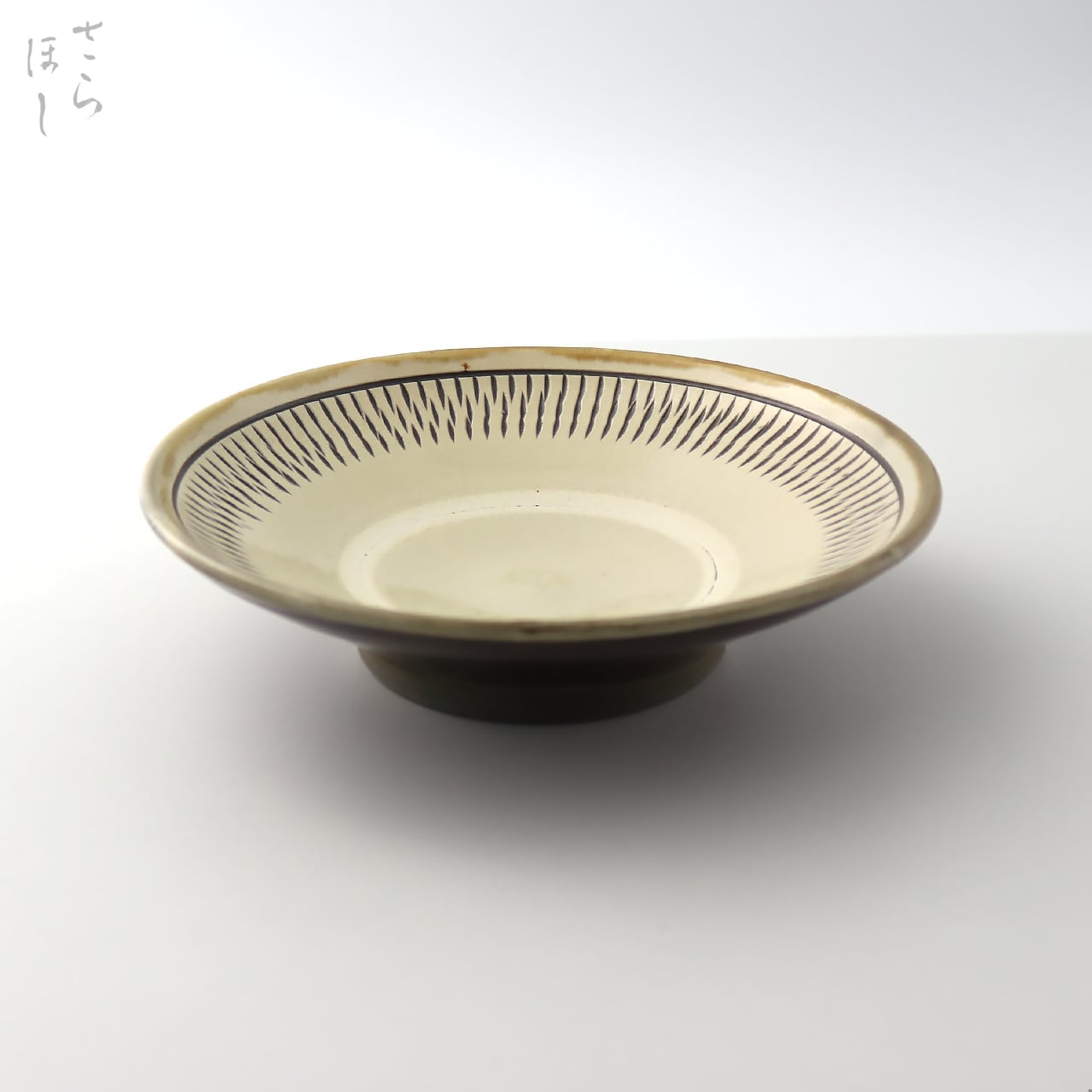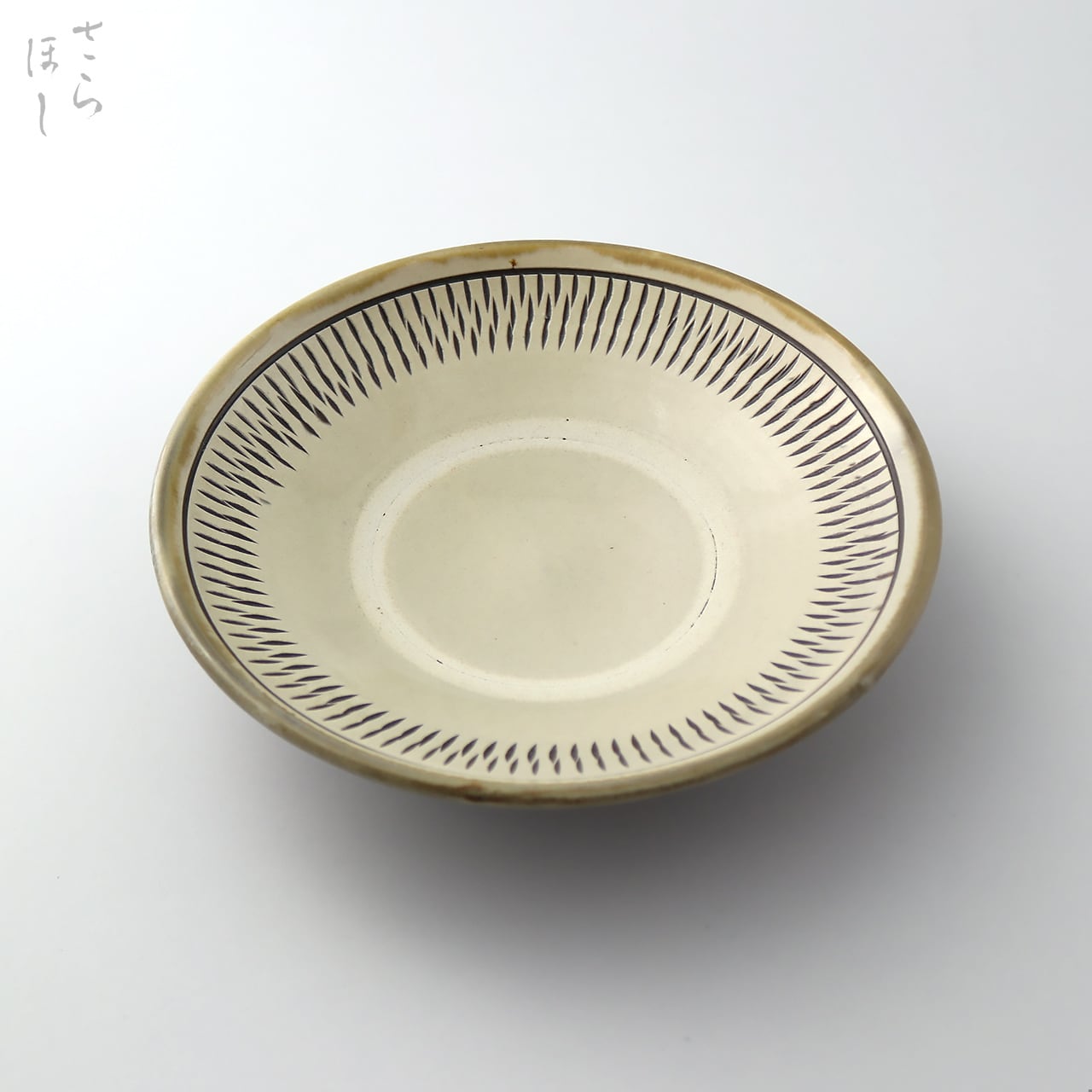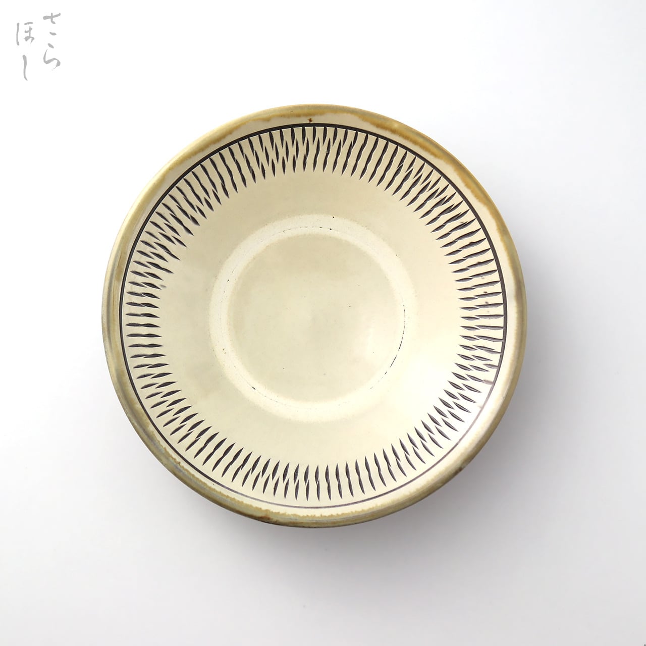 器の内側に小鹿田焼の伝統技法である「飛び鉋(かんな)」を施しています。弾力性のある金属で作った鉋を押し当て、バウンドさせながら細かい連続的な削り目をつけ模様をつける技法です。中心部はあえて飛び鉋をかけず、余白をとったモダンな印象となっています。