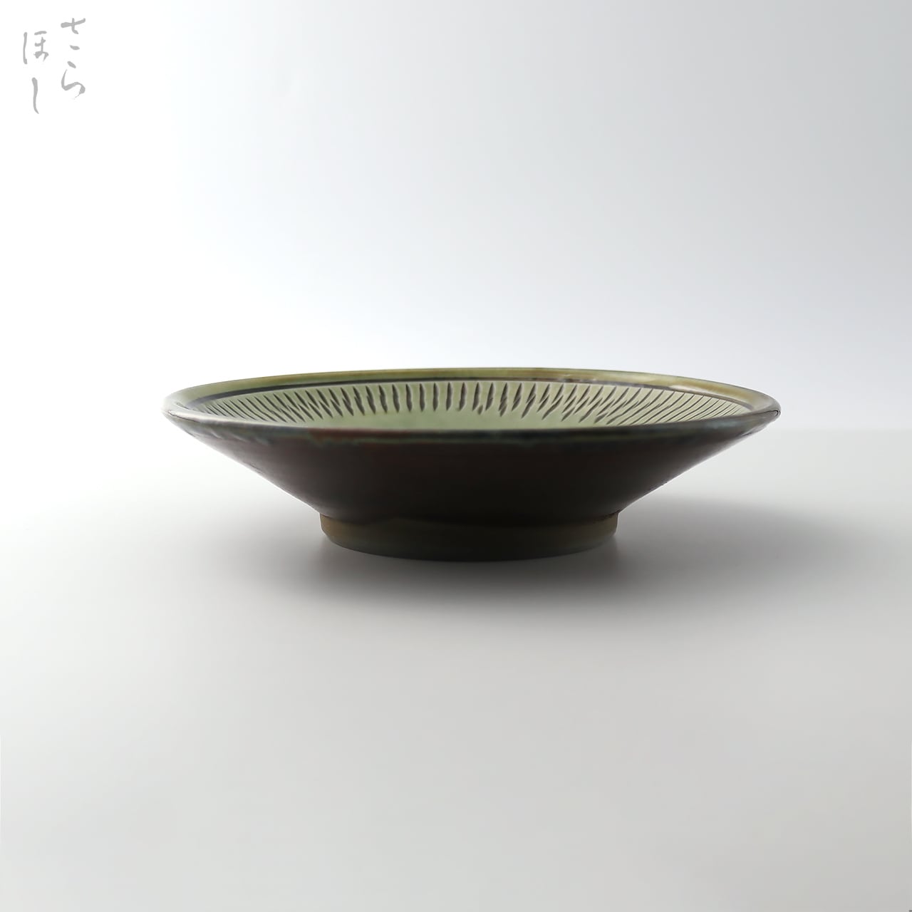 器の内側に小鹿田焼の伝統技法である「飛び鉋(かんな)」を施しています。弾力性のある金属で作った鉋を押し当て、バウンドさせながら細かい連続的な削り目をつけ模様をつける技法です。中心部はあえて飛び鉋をかけず、余白をとったモダンな印象となっています。