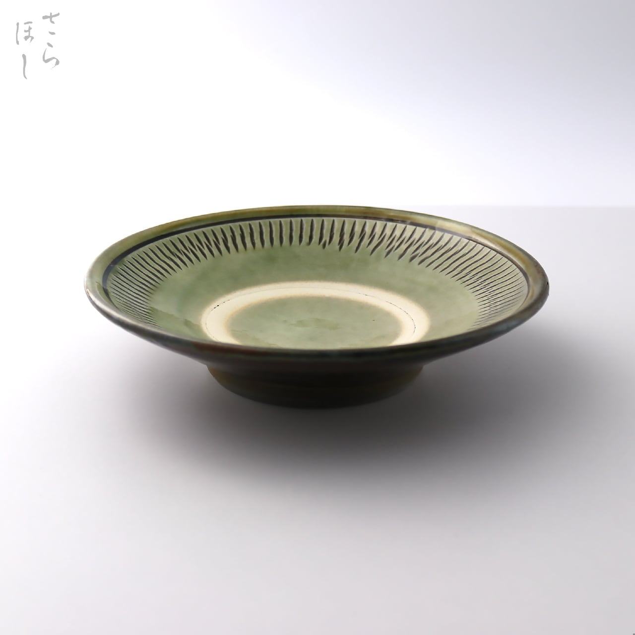 小鹿田焼 小袋窯 6寸皿 中抜き飛びかんな 緑 直径約18.4cm 中皿 陶器 和食器 民藝