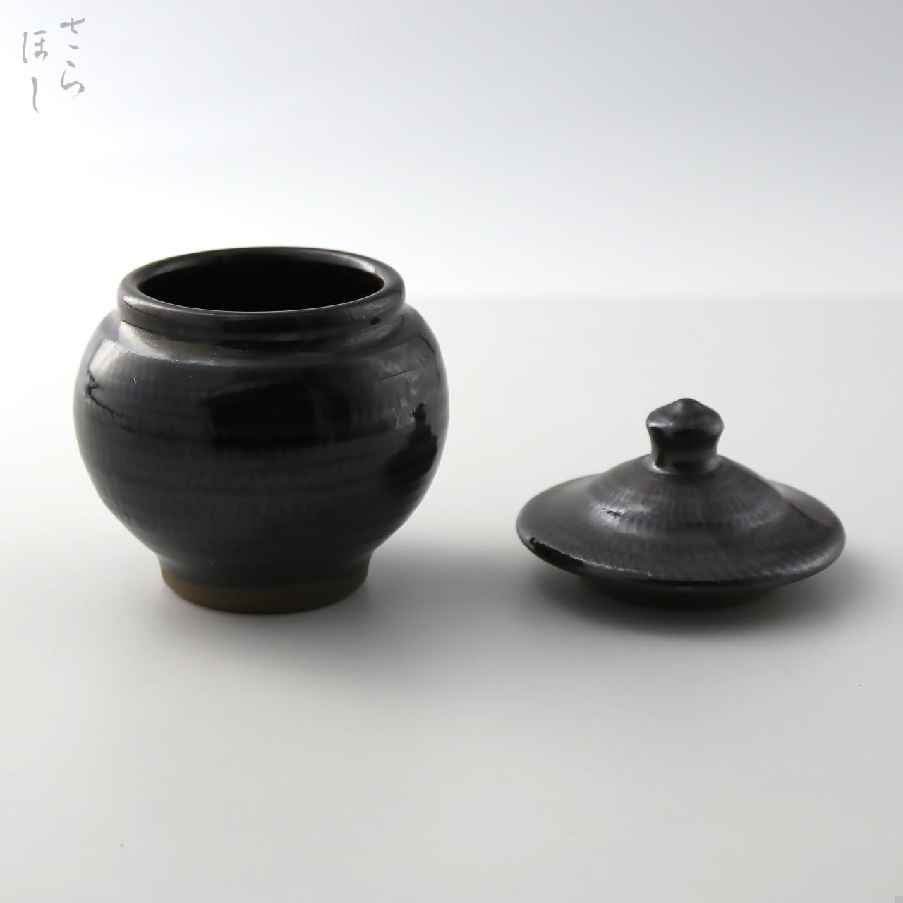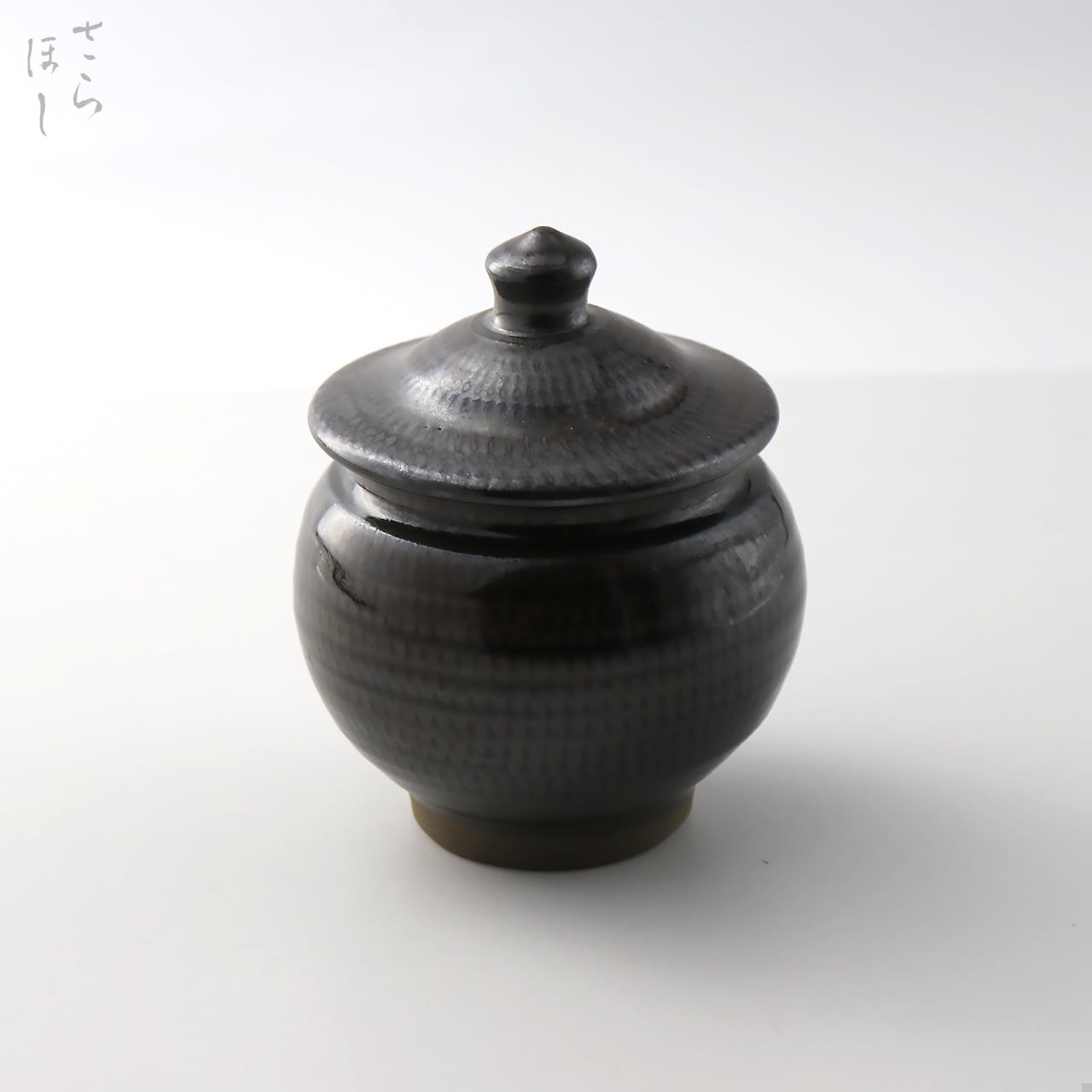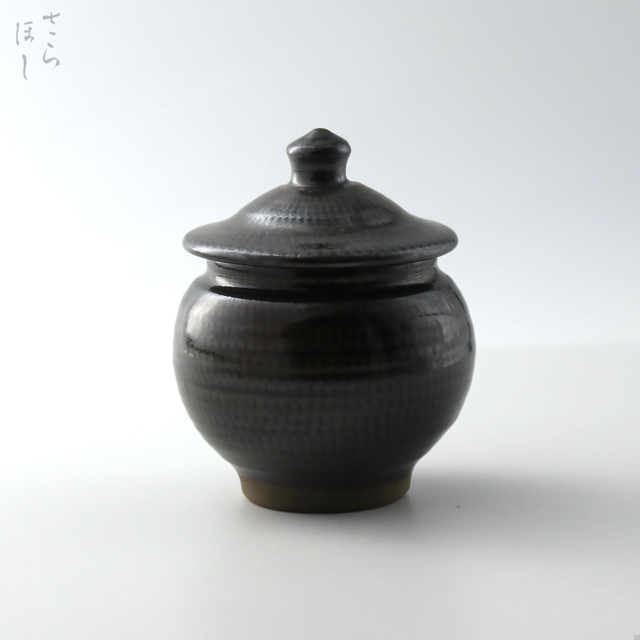 小鹿田焼 小袋窯 一合壺 地飛びかんな 真黒 直径約8.4cm 陶器 和食器 民藝