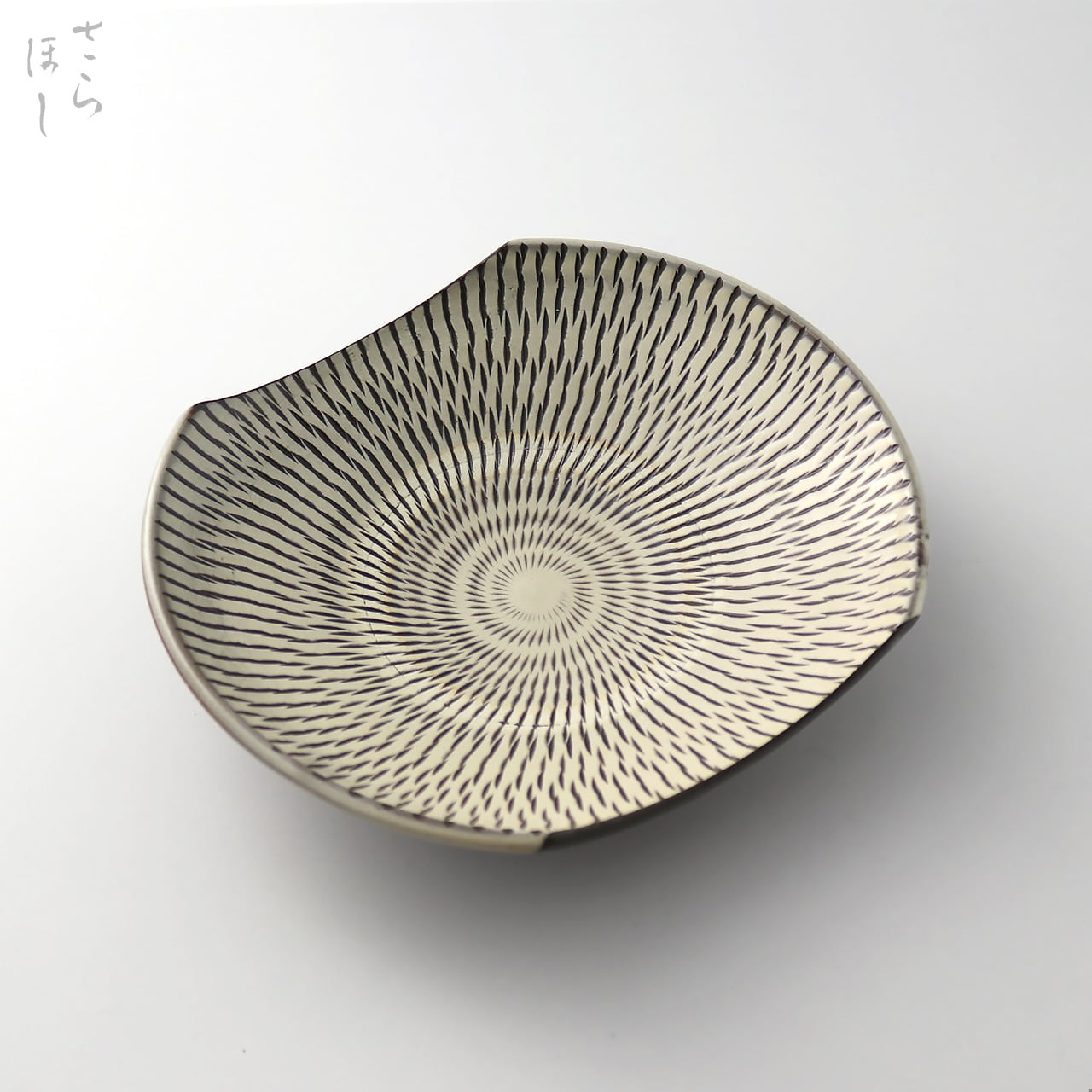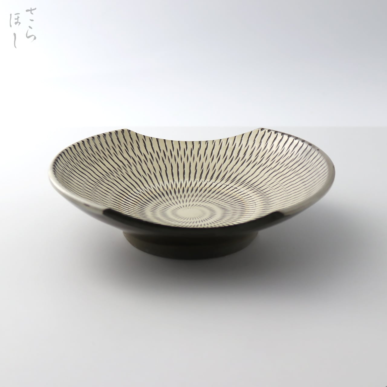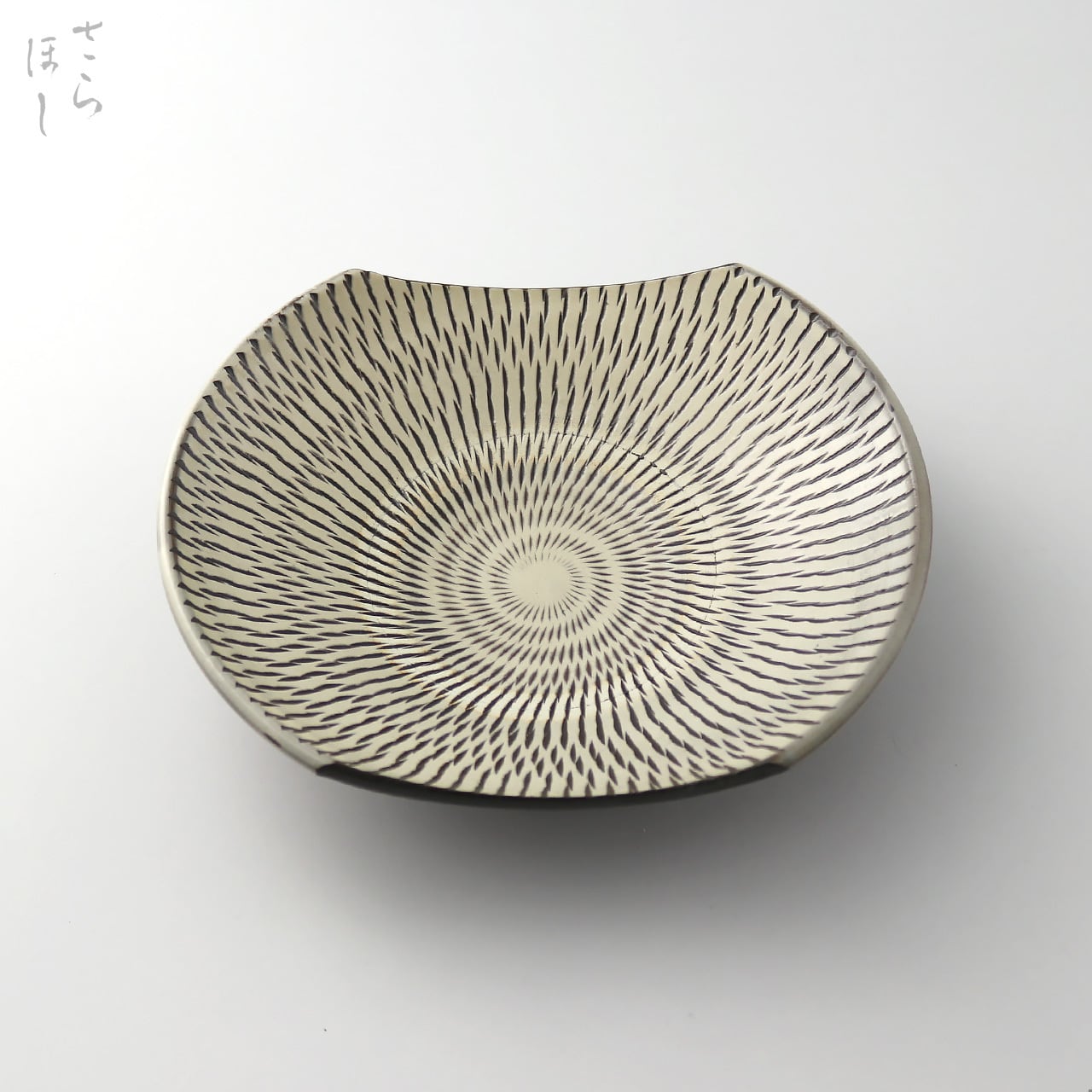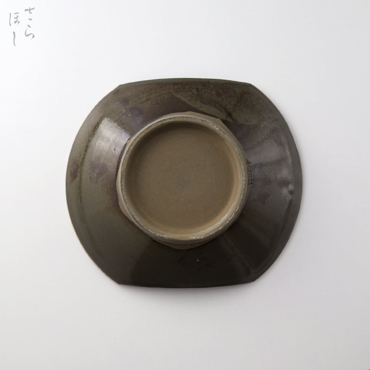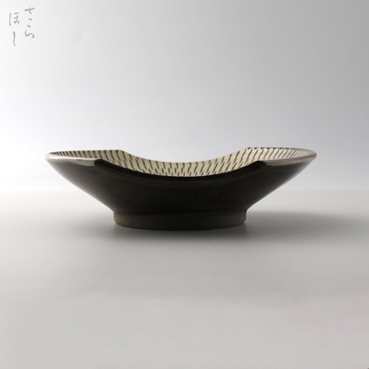 直径が約18.5㎝の中皿で、蹴轆轤で成形するという小鹿田焼の作り方から、一旦丸皿を造り、両端を切り取って楕円形に加工するという手の込んだ作りになっています。一般的な丸い器に対し、角皿は同じ料理を盛っても食卓の雰囲気が違って見えます。料理の盛り付けに変化が欲しい時は是非お試しください。