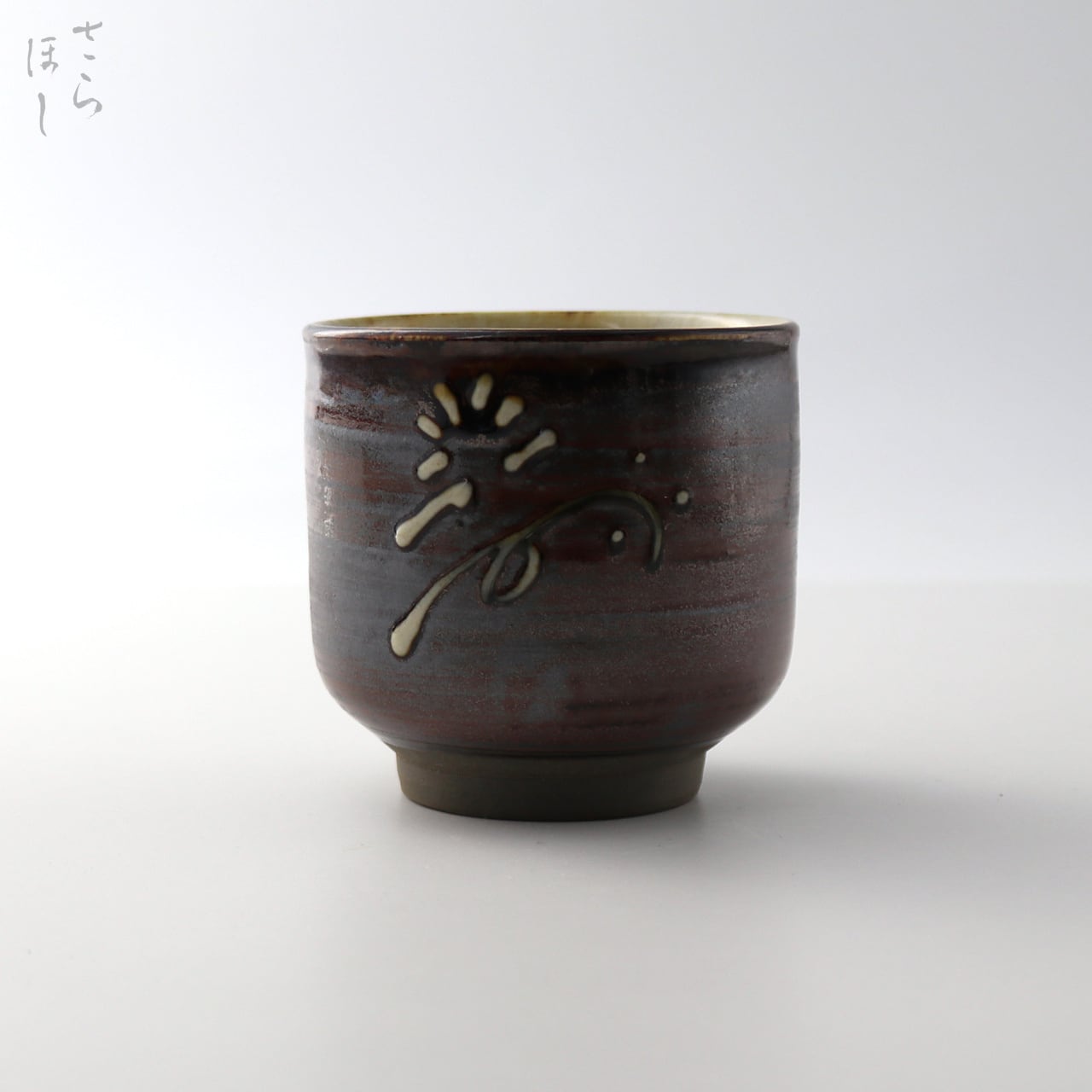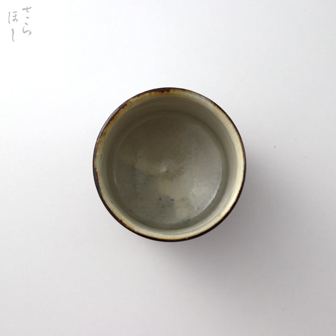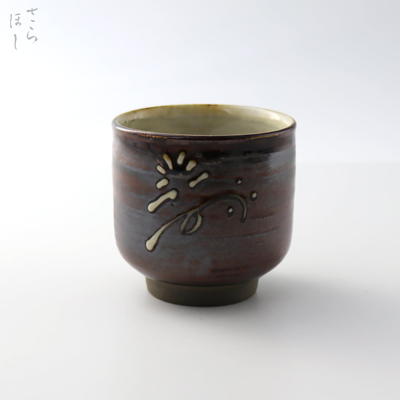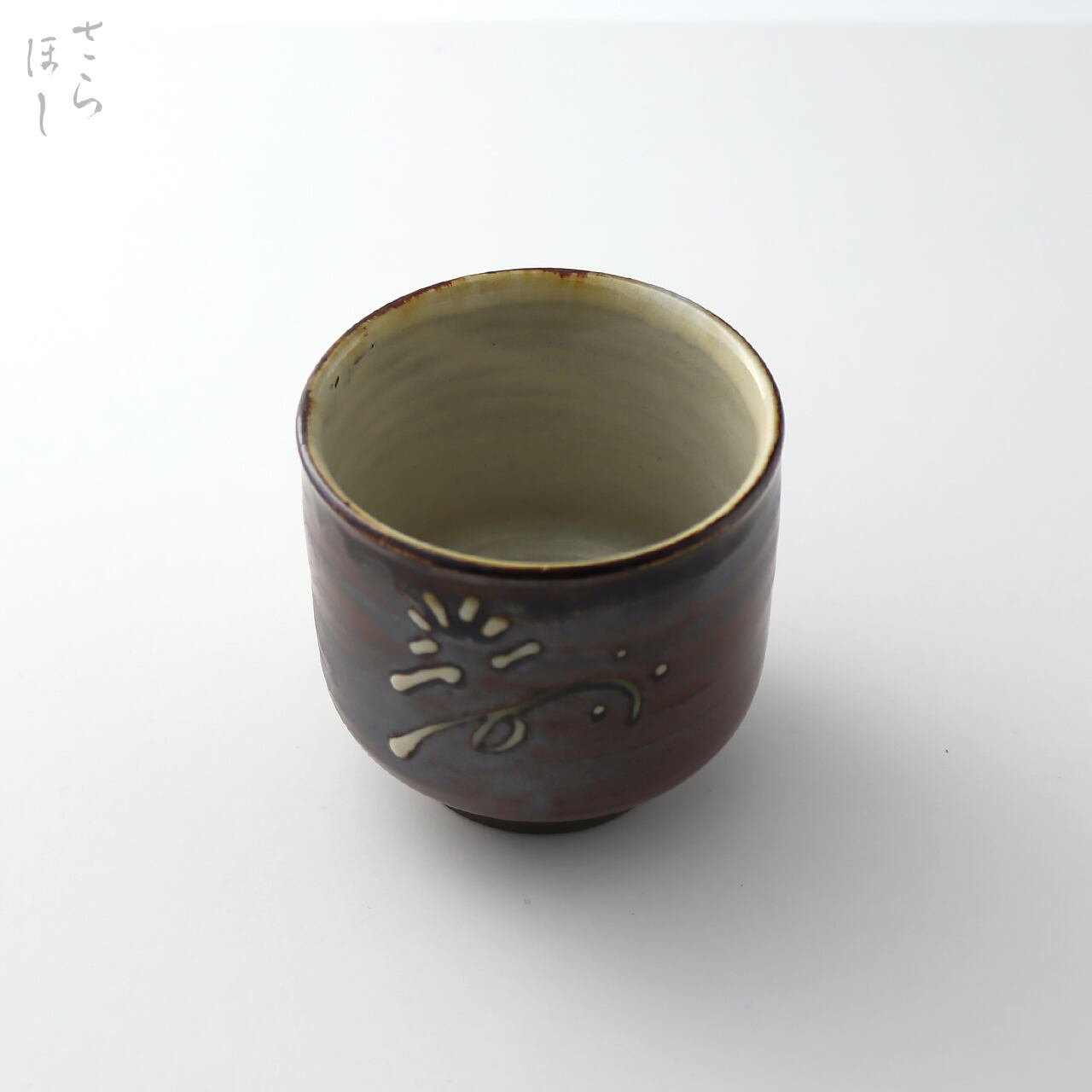口径が約8cmで筒状の湯呑み茶碗です。両手にスッポリ収まるサイズです。筒状の湯呑みはお茶が空気に触れる面積が小さく冷めにくくできています。
