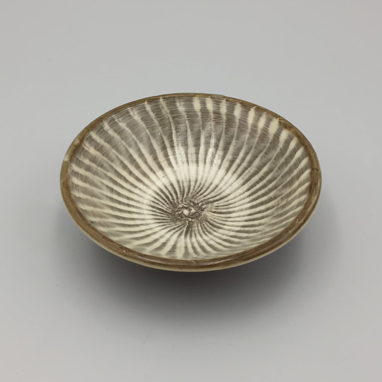 器の内側に小鹿田焼の伝統技法である「打ち刷毛目(はけめ)」を施しています。刷毛を使って化粧土をぐるりと塗り、連続的な模様をつける技法です。