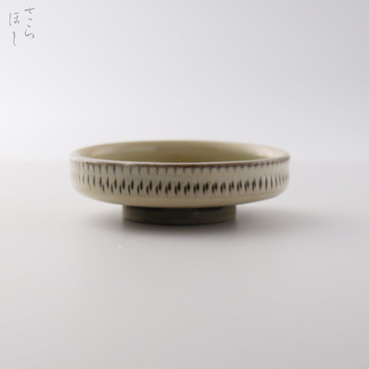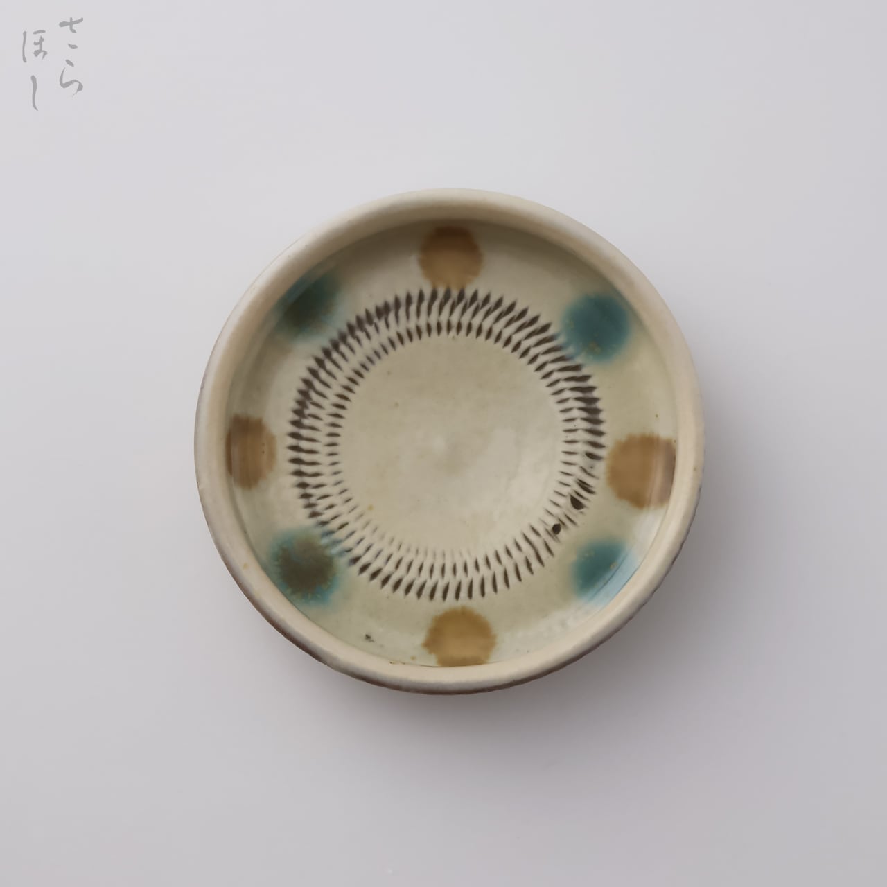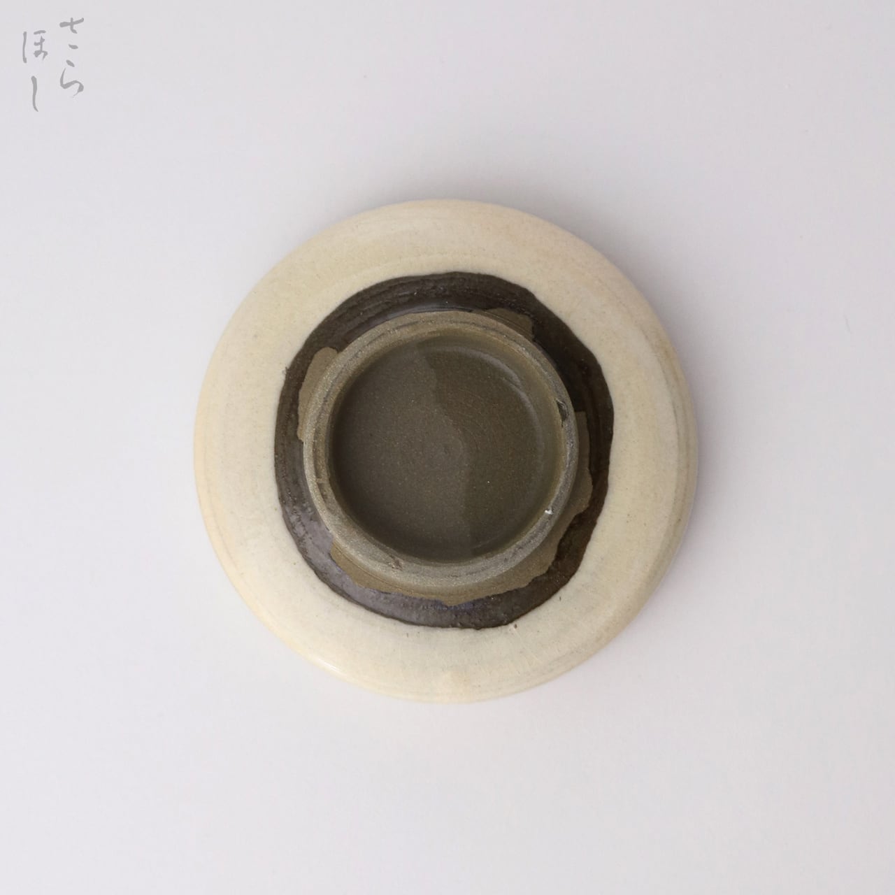 ・お皿等、窯で重ねて焼くものには、中央付近に白い円(目剥ぎ)があるものと無いものがあります。ご注文の際は目剥ぎの有無をご指定いただけません。ご了承ください。重なった部分がくっついてしまわないよう、釉薬を剥がした跡が白い円となって現れたものす。一番上で焼かれたものや、重ねずに焼かれたものには目剥ぎがありません。