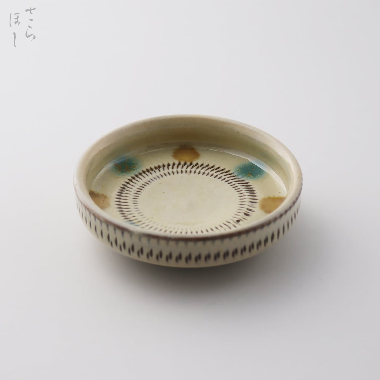 白地に小鹿田焼で伝統的な飴と青の釉薬でドットを描いたモダンで可愛らしいデザインになっています。さらに内外に小鹿田焼の伝統技法である「飛び鉋(かんな)」を施しています。弾力性のある金属で作った鉋を使用し、細かい連続的な削り目をつけ模様をつける技法です。