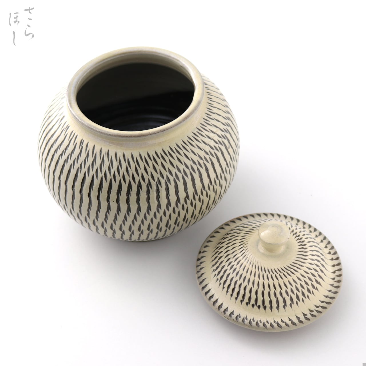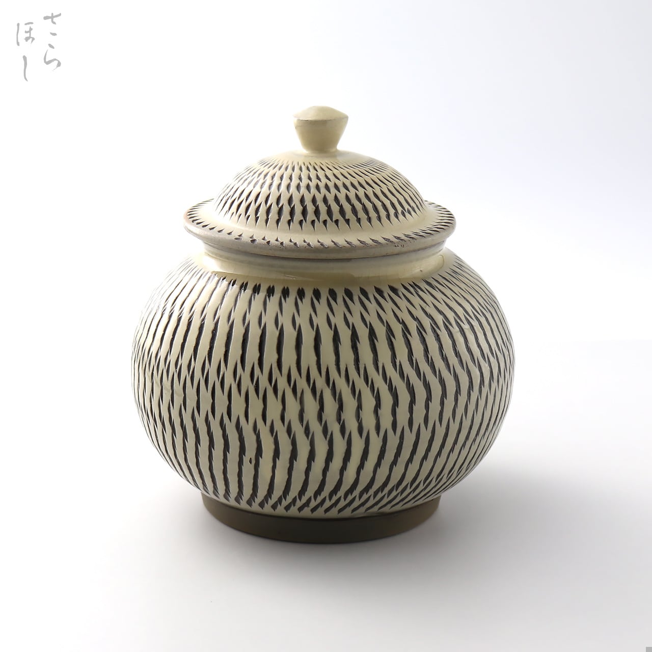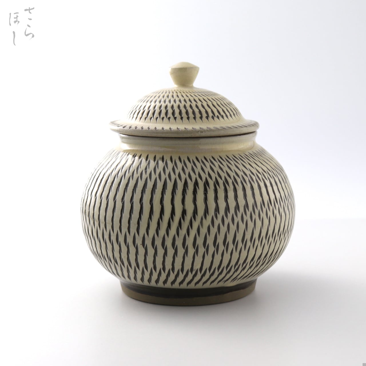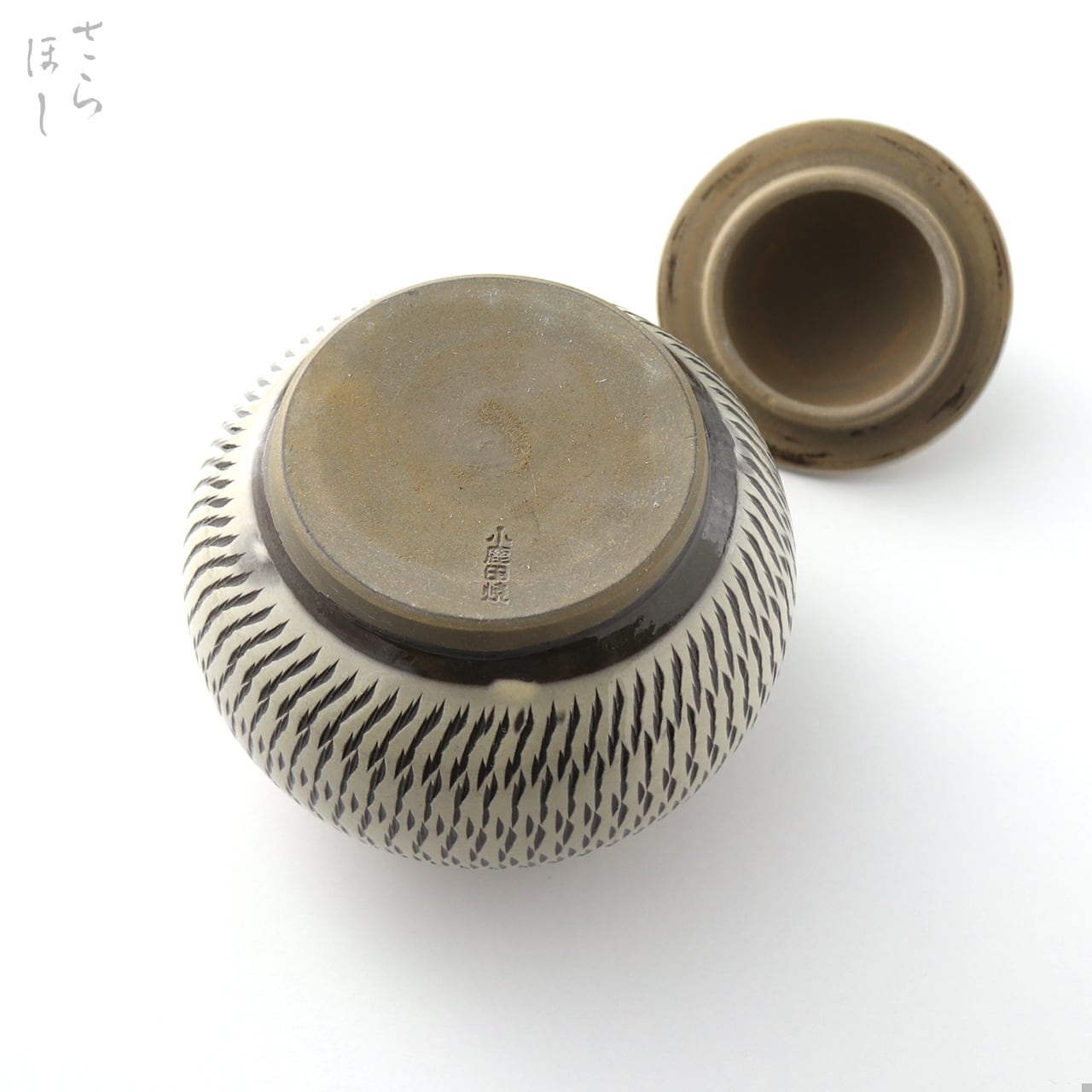 器の外側に小鹿田焼の伝統技法である「飛び鉋(かんな)」を施しています。弾力性のある金属で作った鉋を使用し、細かい連続的な削り目をつけ模様をつける技法です。