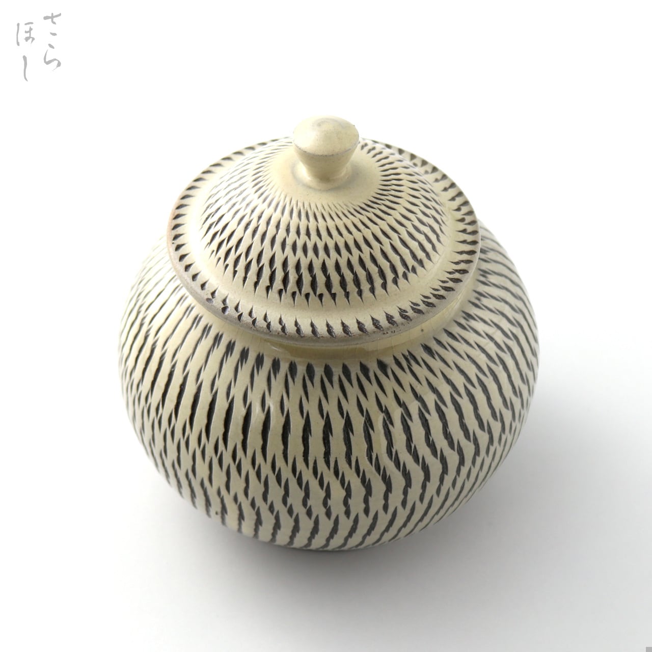 直径約13cmの蓋付き容器です。もとは、地域の特産品で鮎の内蔵を使った塩辛「うるか」を保存するための容器で「うるか壷」と呼ばれています。調味料、薬味、佃煮、梅干し、振り掛けなどの容器やシュガーポットなどに。スプーン穴は無いタイプです。