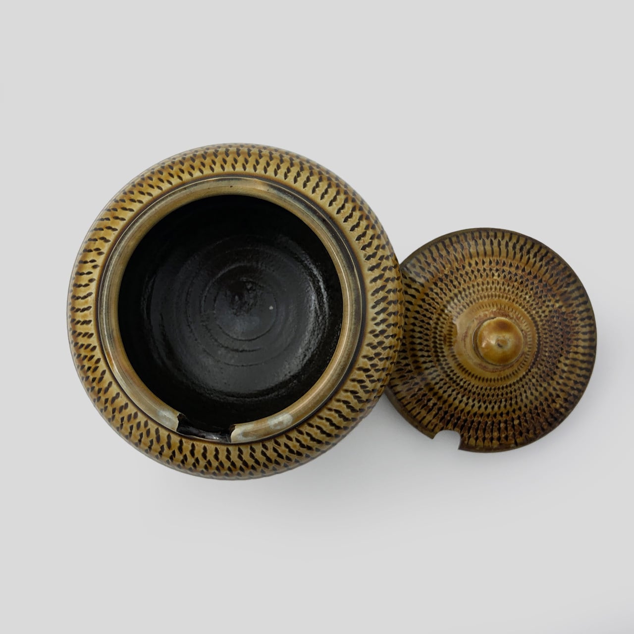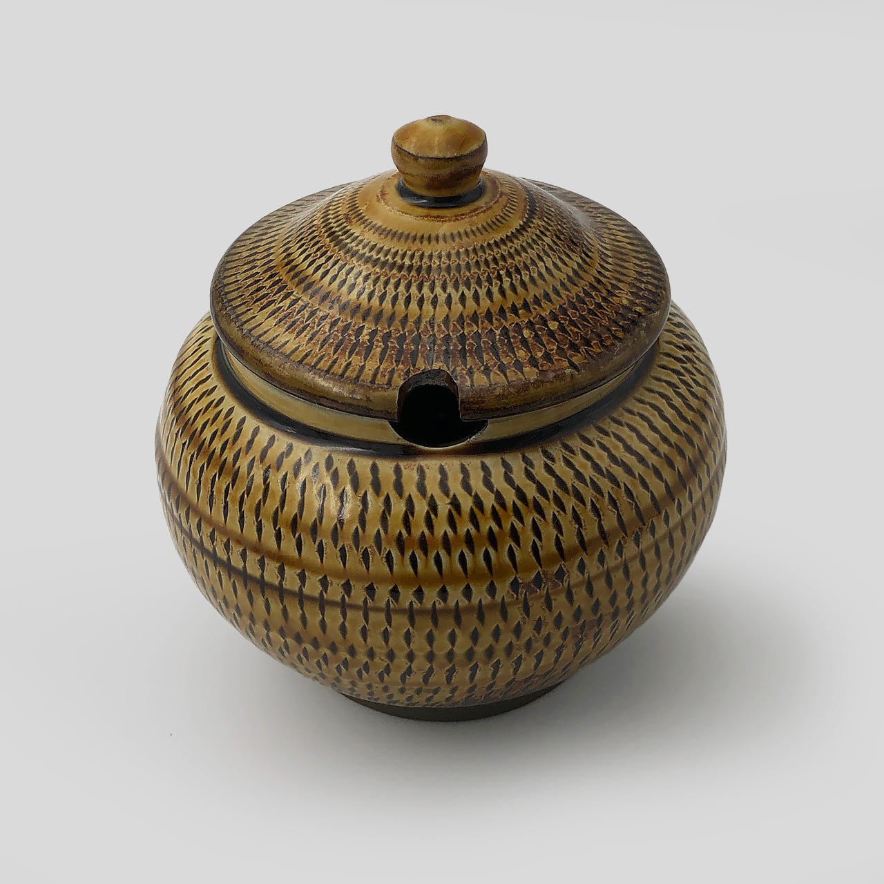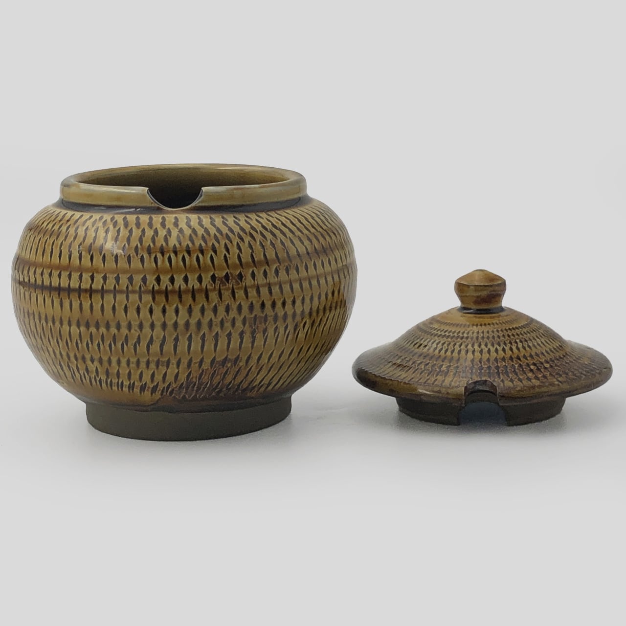 直径約12cmの蓋付き容器です。もとは、地域の特産品で鮎の内蔵を使った塩辛「うるか」を保存するための容器で「うるか壷」と呼ばれています。調味料、薬味、佃煮、梅干し、振り掛けなどの容器やシュガーポットなどに。スプーンを差し込めるようカットされています。