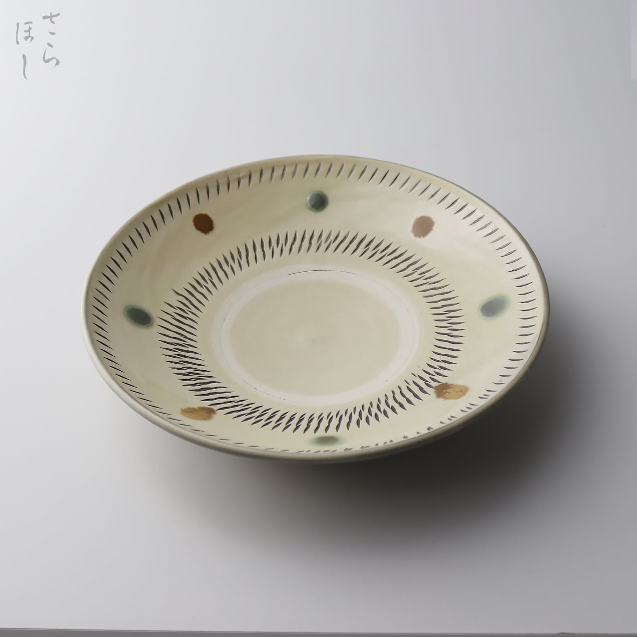 小鹿田焼 小袋窯 8寸カレー皿 飛びかんな 赤青ドット 直径約23.5cm 大皿 陶器 和食器 民藝