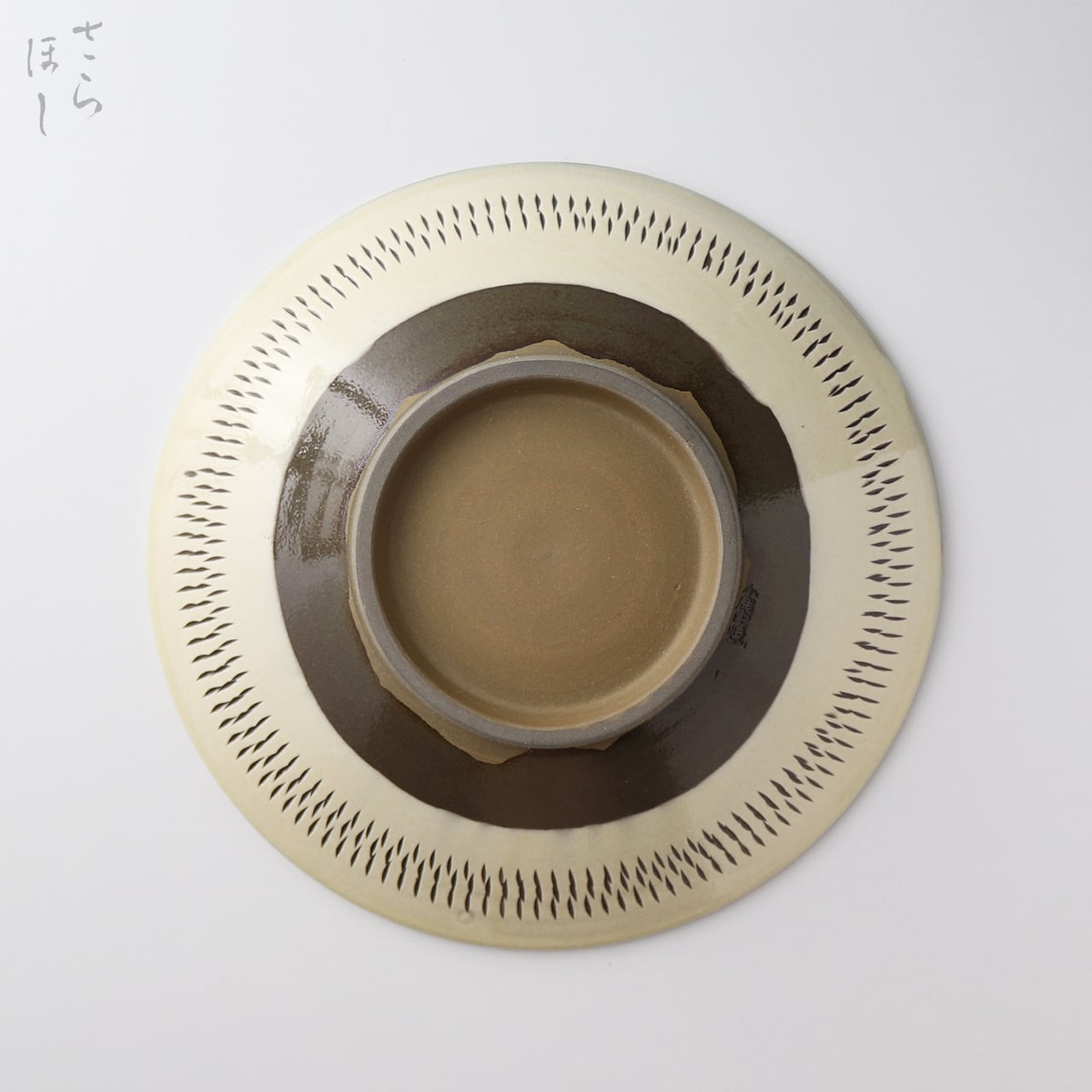 ・お皿等、窯で重ねて焼くものには、中央付近に白い円(目剥ぎ)があるものと無いものがあります。ご注文の際は目剥ぎの有無をご指定いただけません。ご了承ください。重なった部分がくっついてしまわないよう、釉薬を剥がした跡が白い円となって現れたものす。一番上で焼かれたものや、重ねずに焼かれたものには目剥ぎがありません。