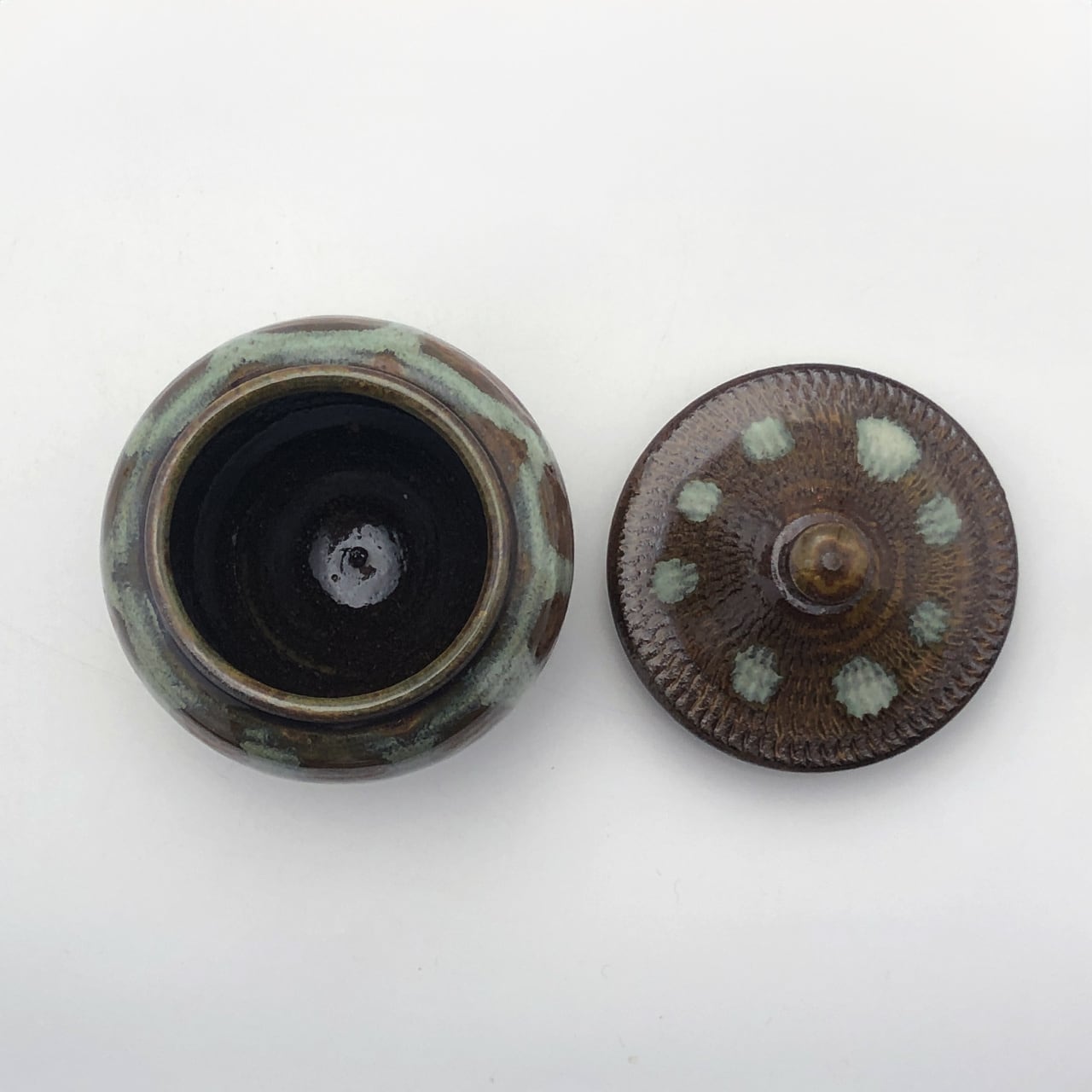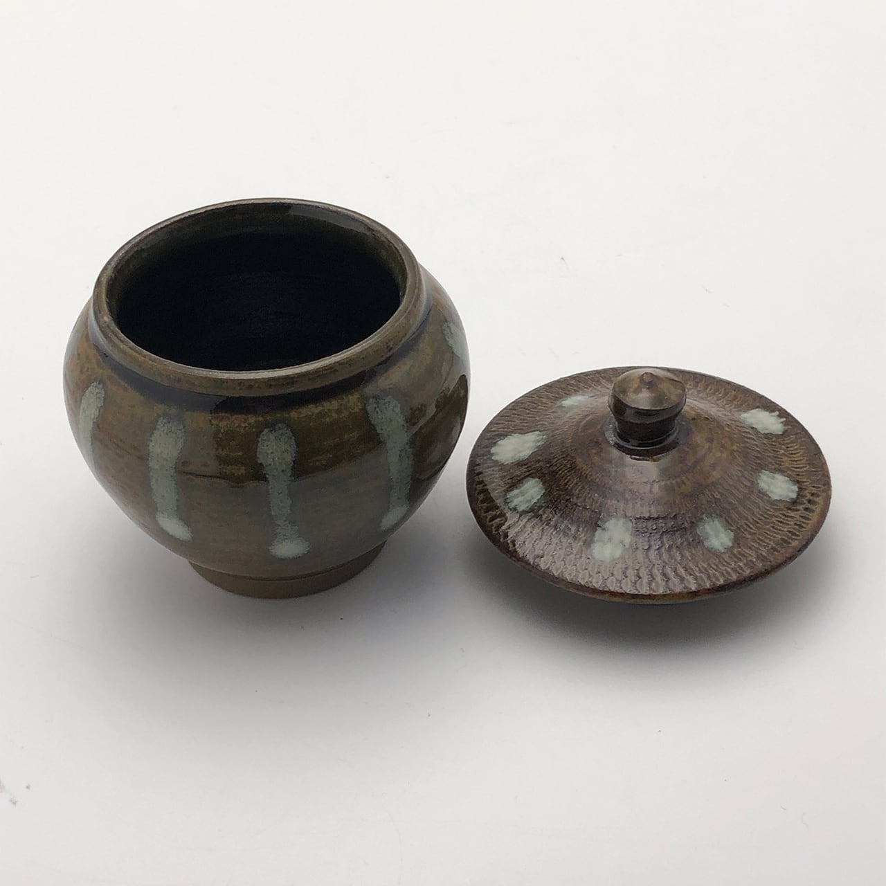 蓋に小鹿田焼の伝統技法である飛び鉋を施し、蓋と胴に白釉でドットを描き、窯の炎で溶かして模様を描いています。炎の当たり方によって、釉薬の色や溶け方が微妙に変化して面白味のある表情となっています。