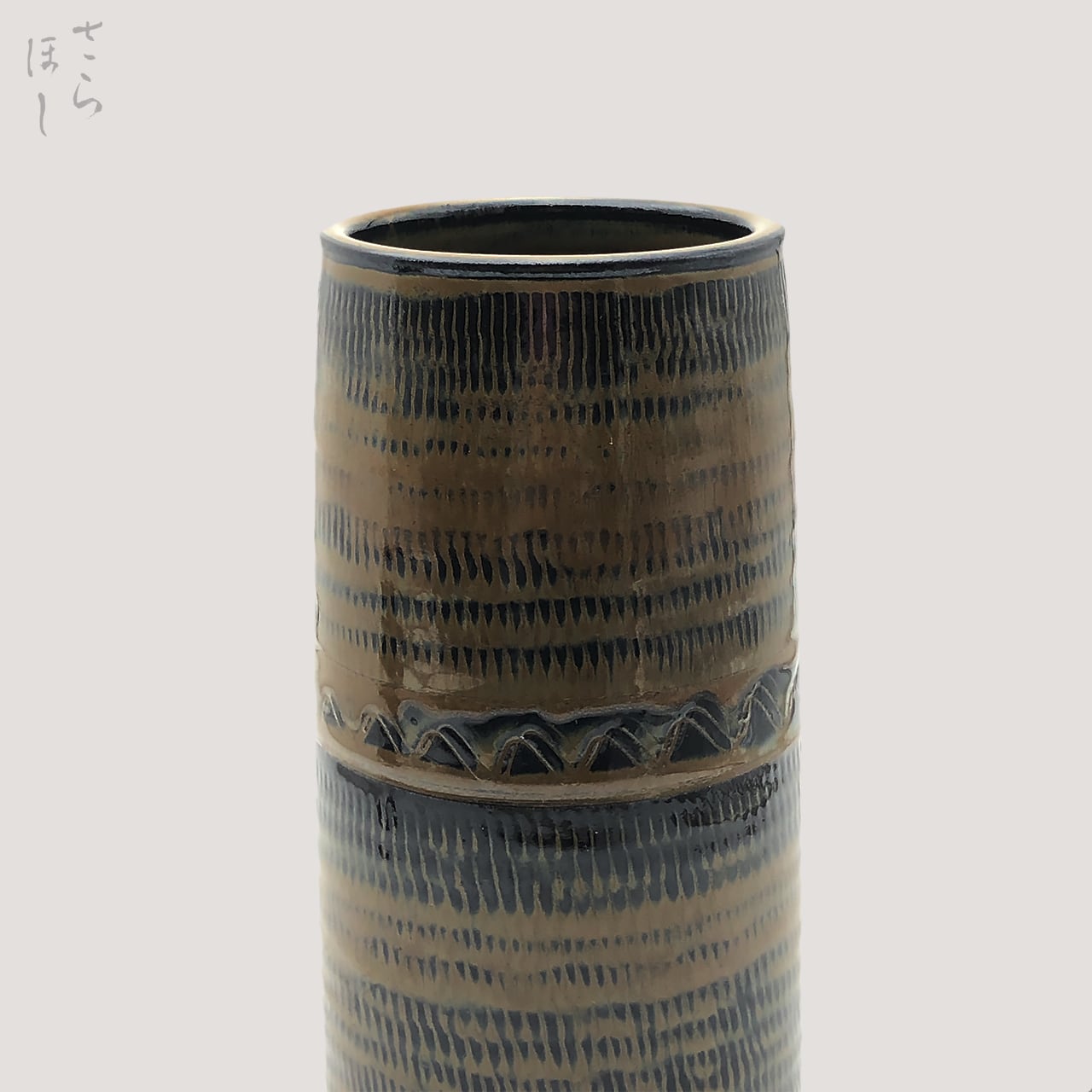 小鹿田焼 小袋窯 7寸筒花瓶 飛びかんな/櫛描き 真黒 高さ約21.3cm 陶器 花器 民藝
