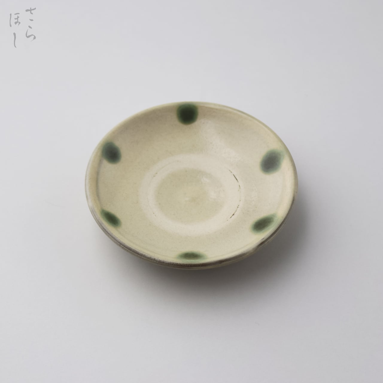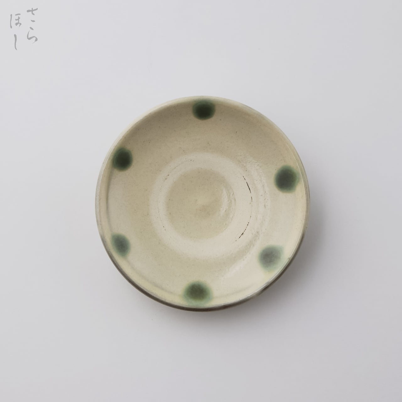 器の内側に緑釉でドットを描いています。釉薬が登り窯の炎で焼かれて溶けだし、ひとつひとつが異なる表情を見せてくれます。