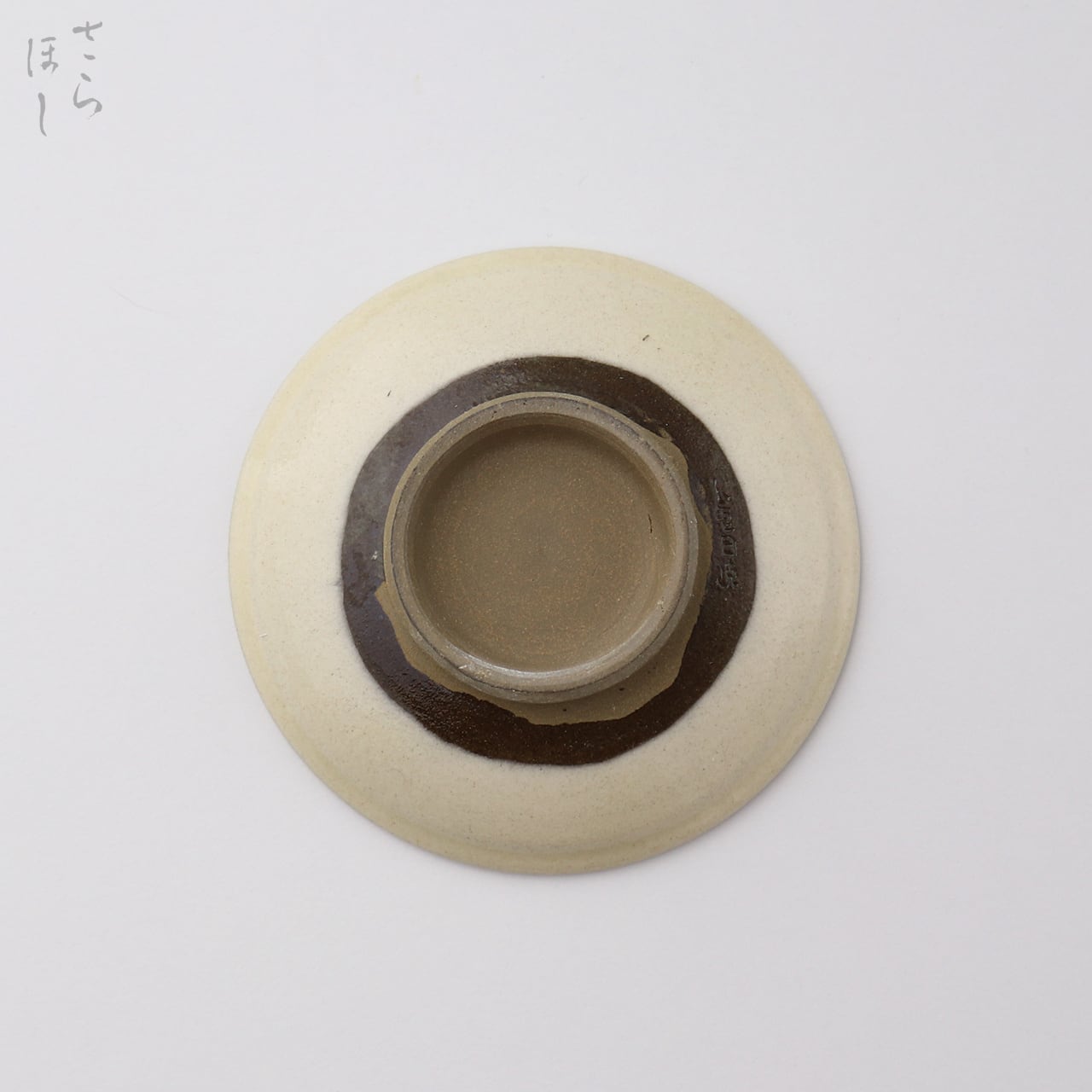 ・お皿等、窯で重ねて焼くものには、中央付近に白い円(目剥ぎ)があるものと無いものがあります。ご注文の際は目剥ぎの有無をご指定いただけません。ご了承ください。重なった部分がくっついてしまわないよう、釉薬を剥がした跡が白い円となって現れたものす。一番上で焼かれたものや、重ねずに焼かれたものには目剥ぎがありません。