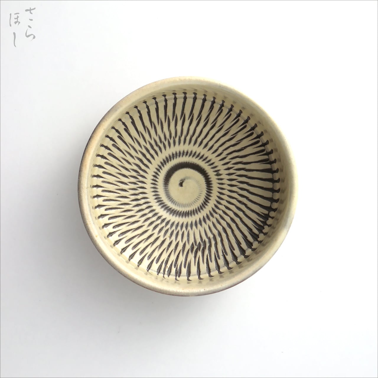 器の内外に小鹿田焼の伝統技法である「飛び鉋(かんな)」を施しています。弾力性のある金属で作った鉋を使用し、蹴轆轤で回しながら鉋を押し当てて細かい連続的な削り目をつけ模様をつける技法です。