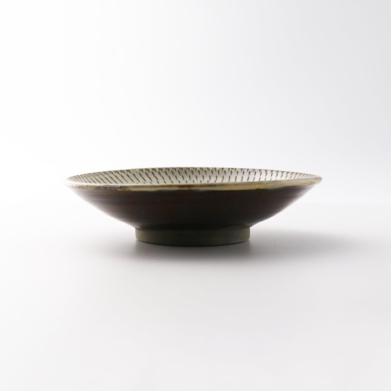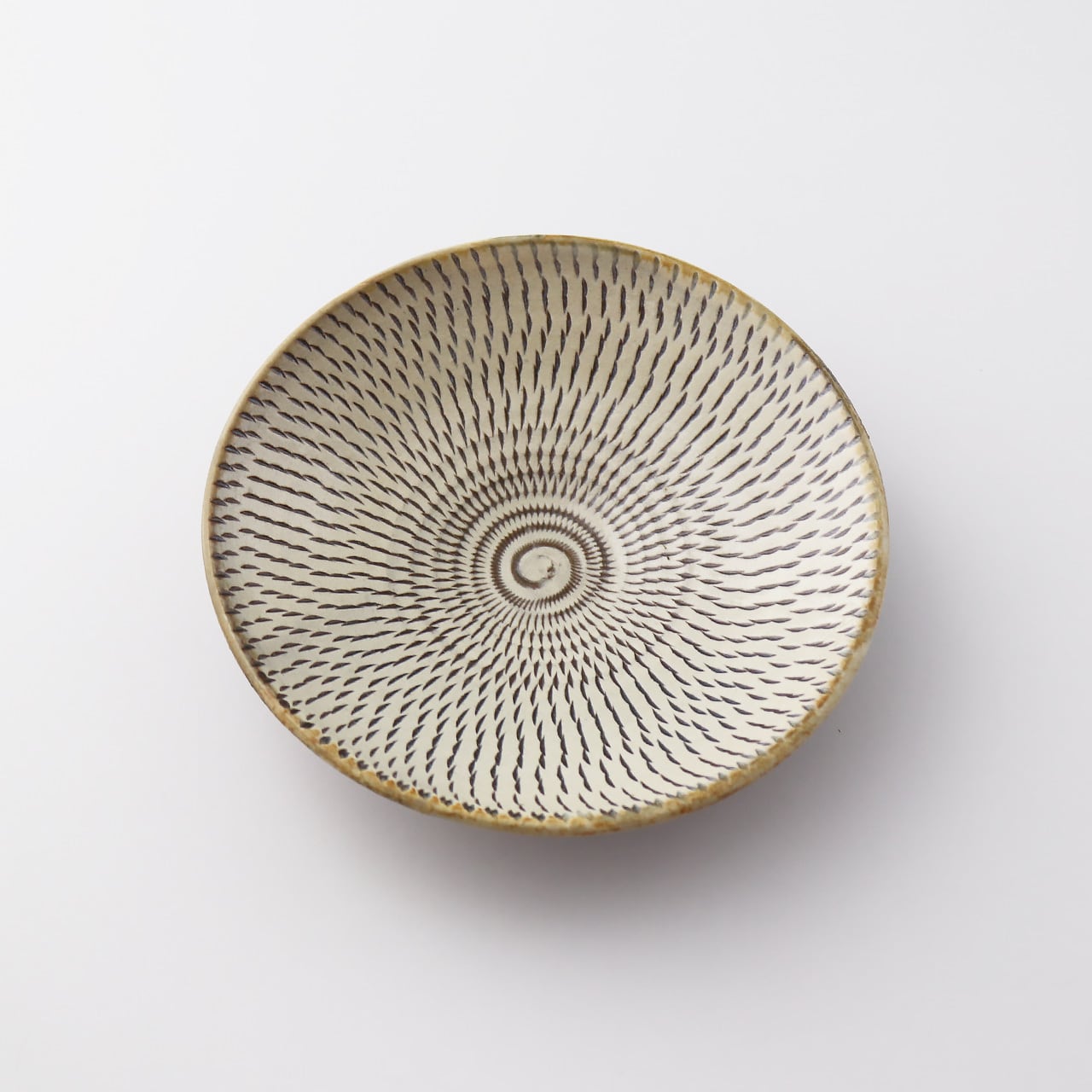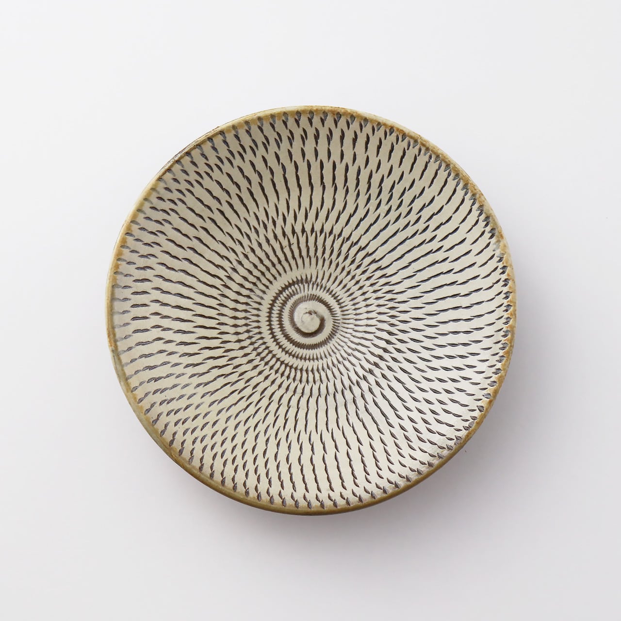 器の内側に小鹿田焼の伝統技法である「打ち刷毛目(はけめ)」を施しています。刷毛を使って化粧土をぐるりと塗り、連続的な模様をつける技法です。