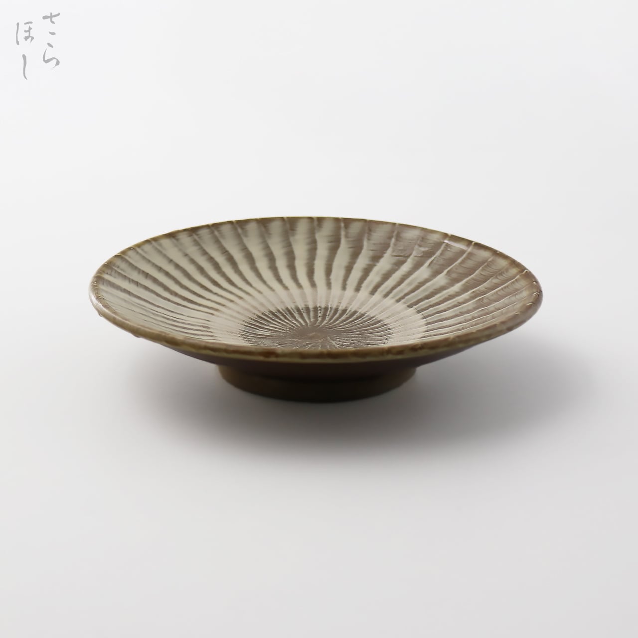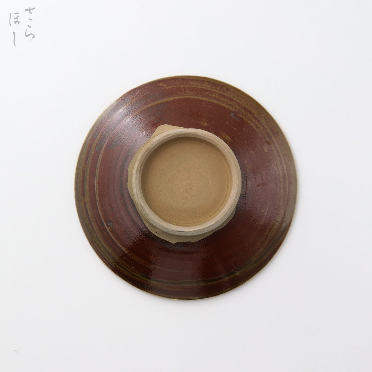 ・お皿等、窯で重ねて焼くものには、中央付近に白い円(目剥ぎ)があるものと無いものがあります。ご注文の際は目剥ぎの有無をご指定いただけません。ご了承ください。重なった部分がくっついてしまわないよう、釉薬を剥がした跡が白い円となって現れたものす。一番上で焼かれたものや、重ねずに焼かれたものには目剥ぎがありません。