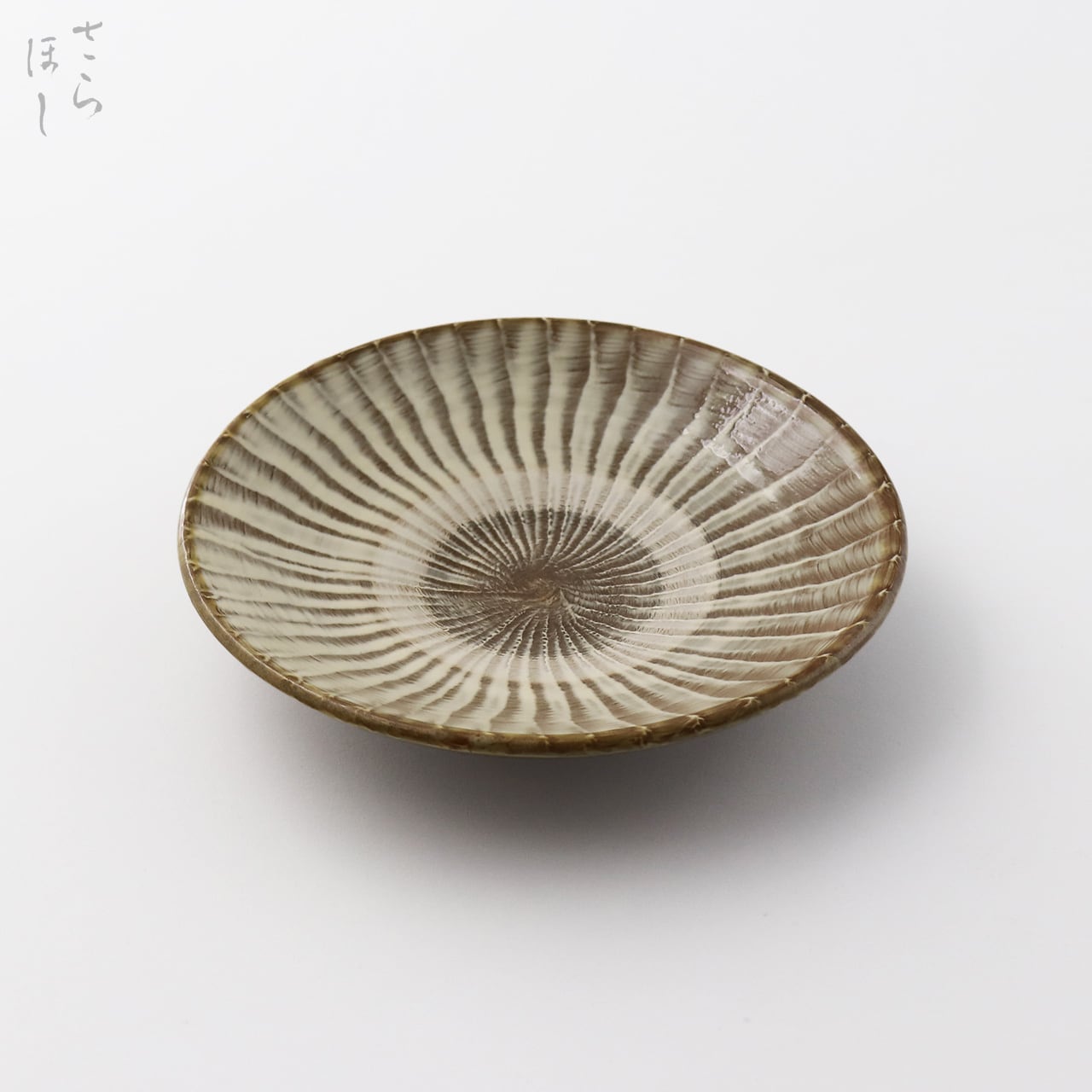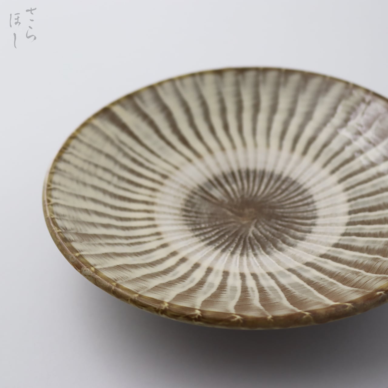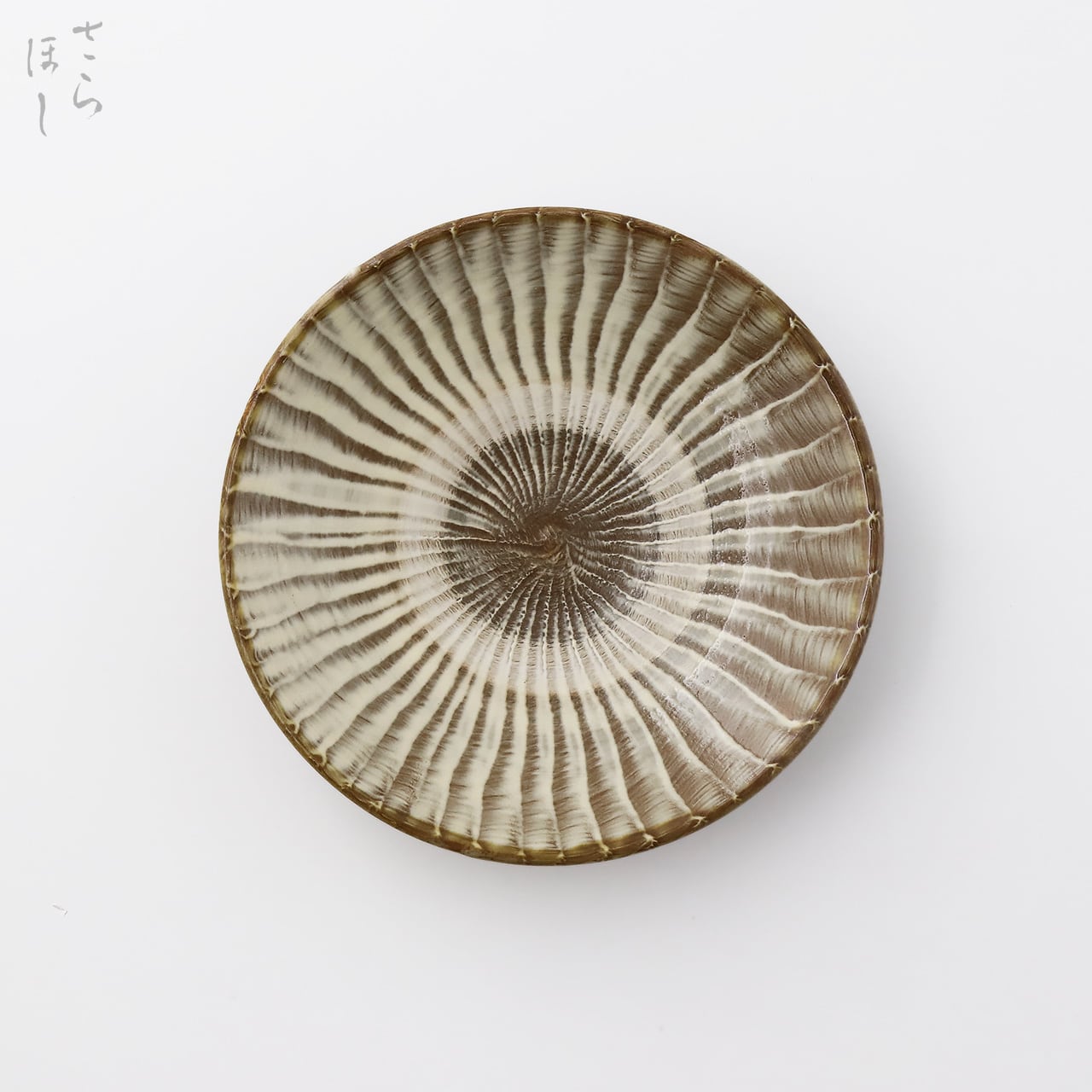 器の内側に小鹿田焼の伝統技法である「打ち刷毛目(はけめ)」を施しています。刷毛を使って化粧土をぐるりと塗り、連続的な模様をつける技法です。