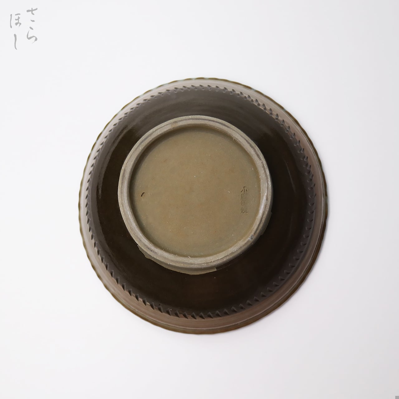 ・お皿等、窯で重ねて焼くものには、中央付近に白い円(目剥ぎ)があるものと無いものがあります。ご注文の際は目剥ぎの有無をご指定いただけません。ご了承ください。重なった部分がくっついてしまわないよう、釉薬を剥がした跡が白い円となって現れたものす。一番上で焼かれたものや、重ねずに焼かれたものには目剥ぎがありません。
