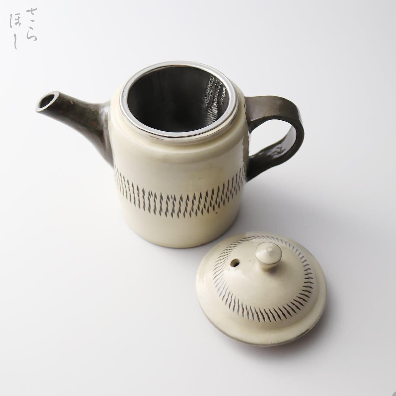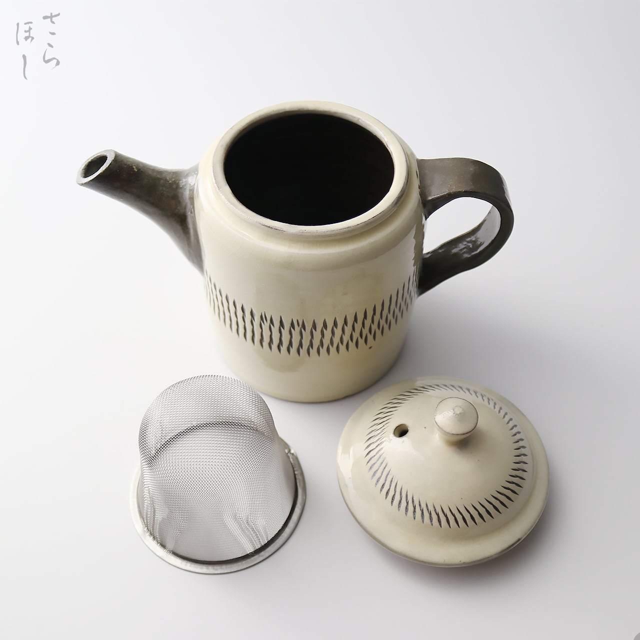 陶器製で保温性に優れ、コーヒーや紅茶、水などの飲み物の他、料理用の出汁等の容器としても使えます。取り外して洗うことができる「かご網」茶こし付きです。