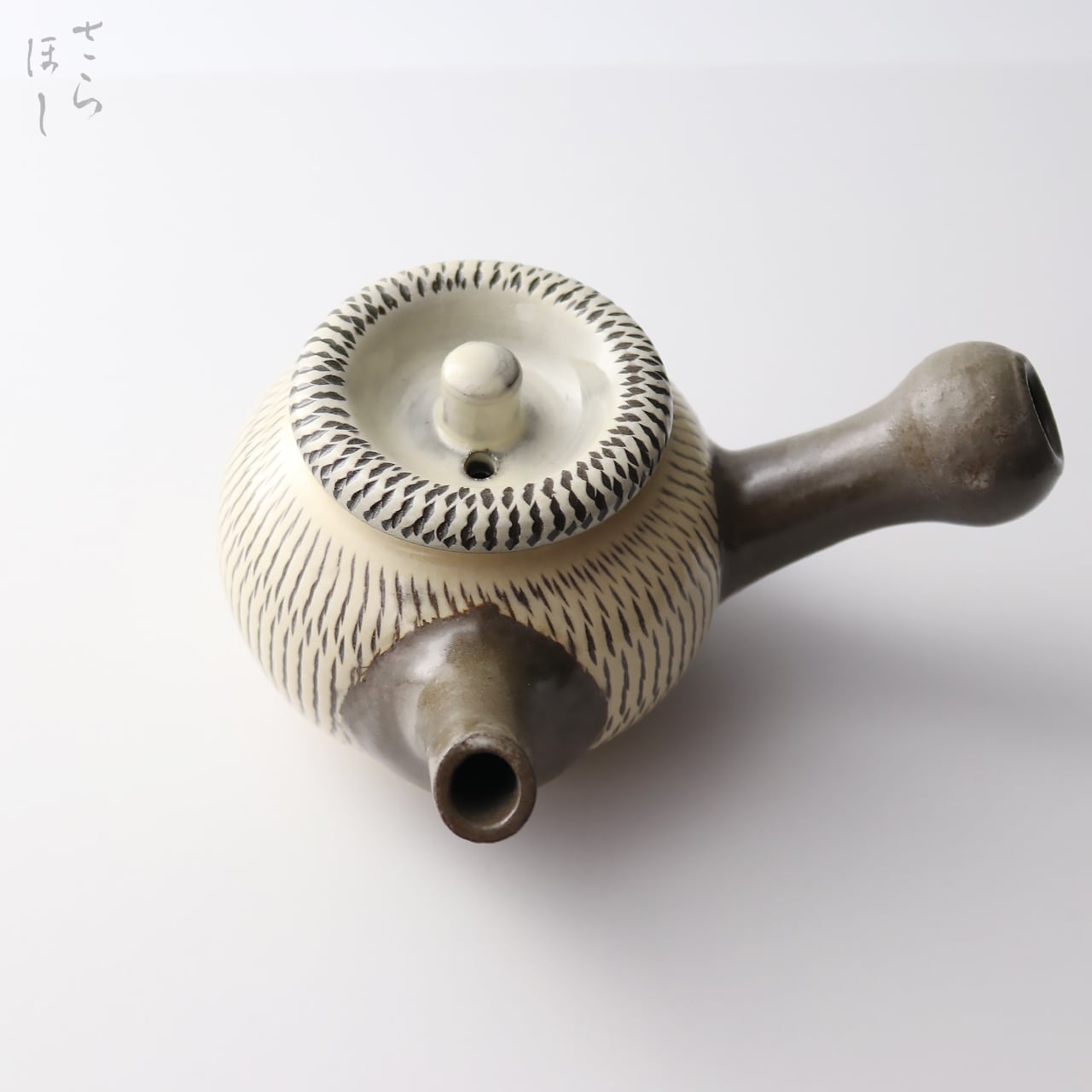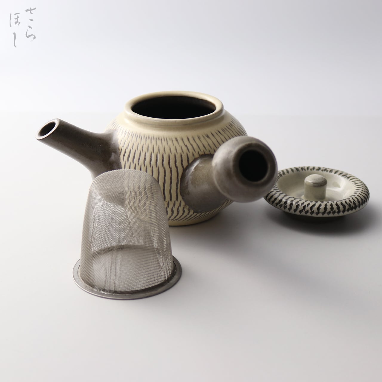 陶器製で保温性に優れ、注ぎ口に対し持ち手が横につく横手型の持ち手は大きめで、しっかり握れて注ぎやすくできています。茶葉を入れて湯を注ぎ、湯飲み茶碗などに注ぐためのもので「茶出し」とも言います。急須から取り外して洗うことができる「かご網」茶こし付きです。