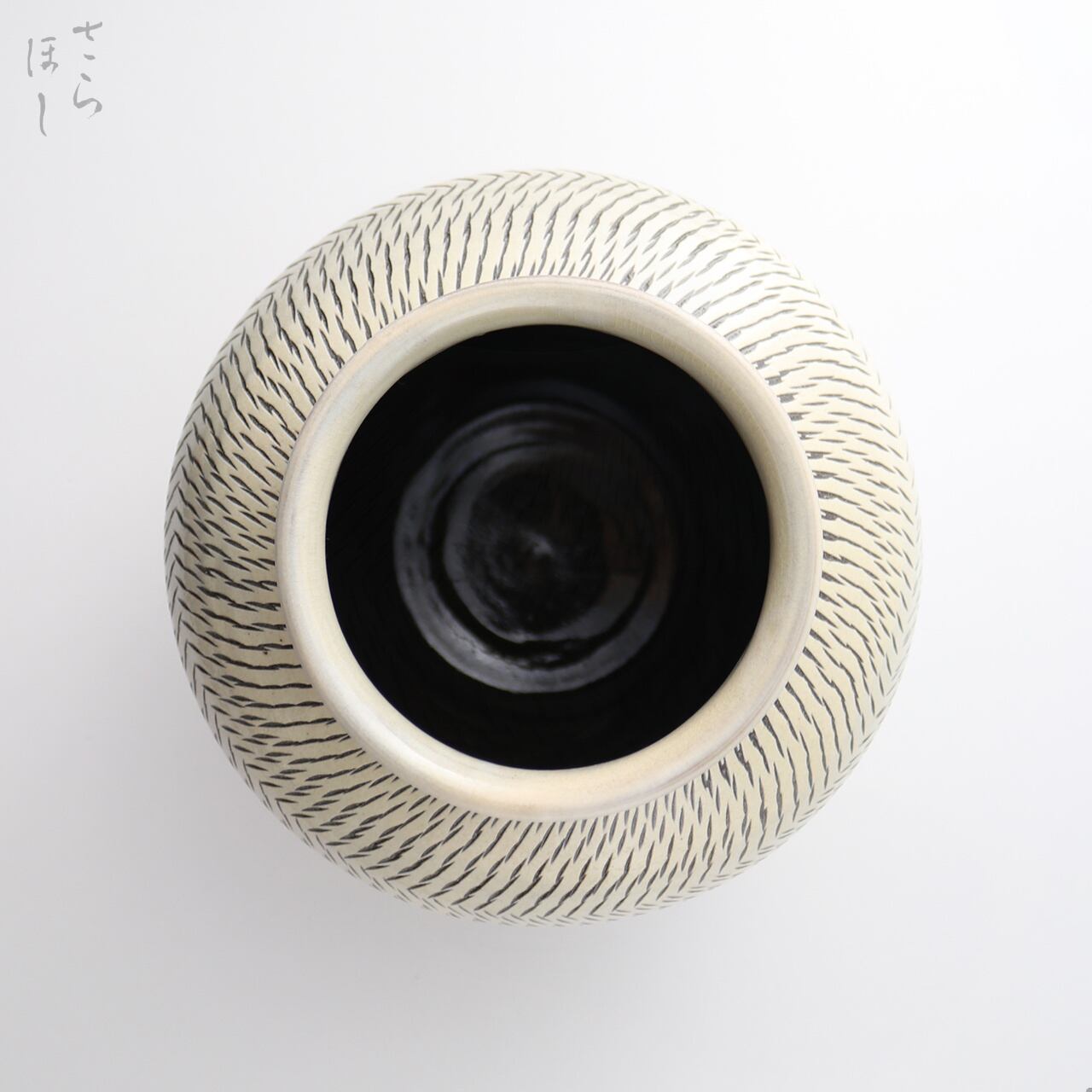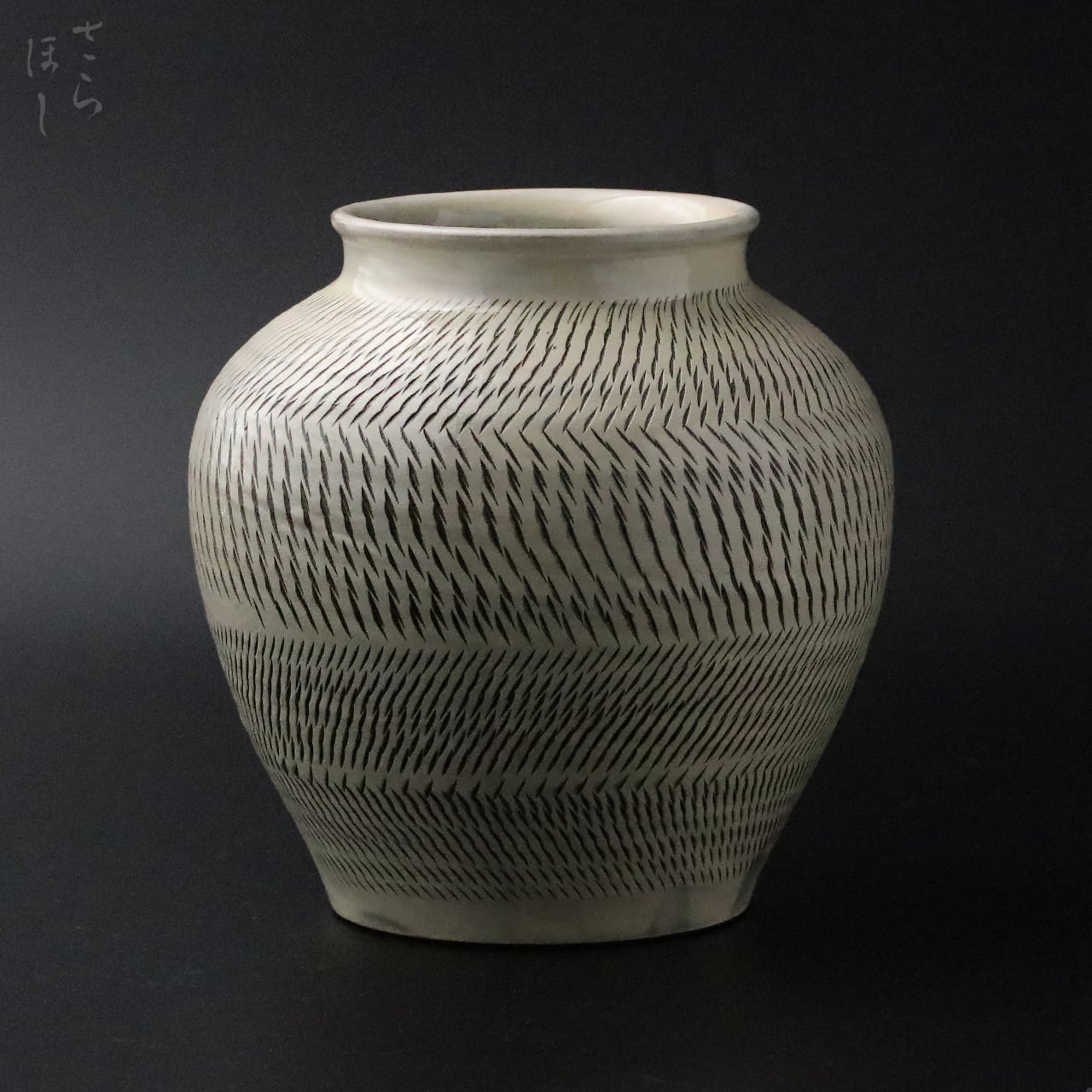 高さが約18.5cmの丸花瓶で、器の外側全面に素地の段階で小鹿田焼の伝統技法である「飛び鉋(かんな)」を施しています。飛び鉋は、弾力性のある金属で作った鉋を使用し、細かい連続的な削り目をつけ模様をつける技法です。ここでは器の外側を4層に分け、飛び鉋を交互に角度をつけて打つことで変化や動きが出ており、自然界の風雨のような面白味があります。