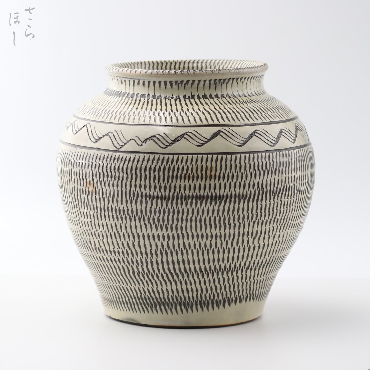 【一点もの】小鹿田焼 小袋窯 1升丸花瓶 飛びかんな/櫛描き 白 高さ約18cm 花器 茶道具 民藝