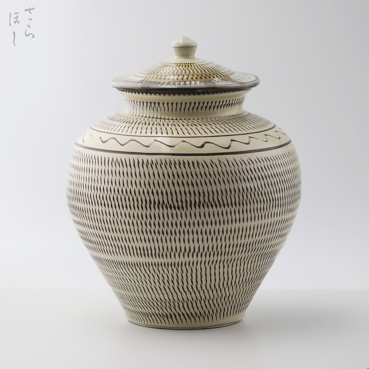 高さが約20.5cmの丸花瓶で、小鹿田焼の代表的技法である飛び鉋かんなと釉の打ち掛けが施されています。飛び鉋は、弾力性のある金属で作った鉋を使用し、細かい連続的な削り目をつけ模様をつける技法です。さらに、上部に木材で波線を描く「櫛描き」を加えてアクセントを付けています。蓋には緑釉、飴釉を打ち掛けています。柄杓で軽く水をまくような動作で施釉するもので、飛び鉋や打ち刷毛目と併用することが多く、即興的な面白さがあります。