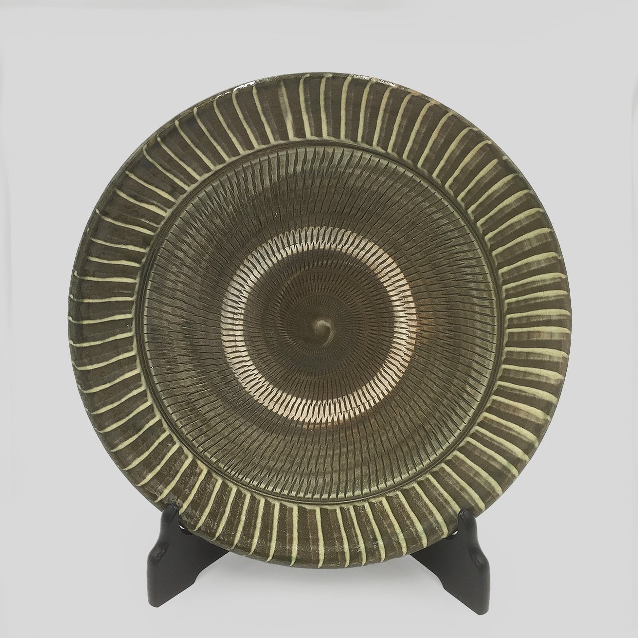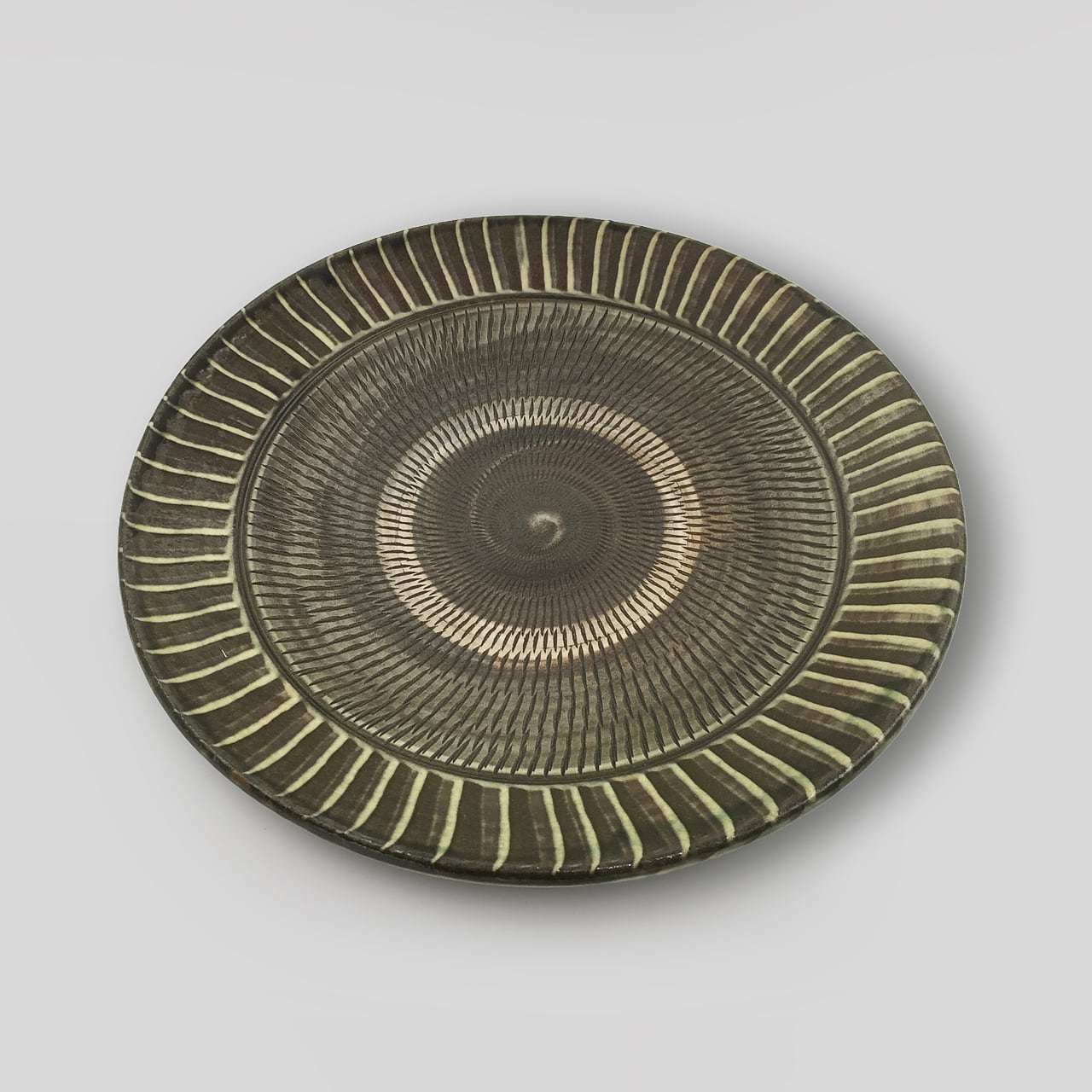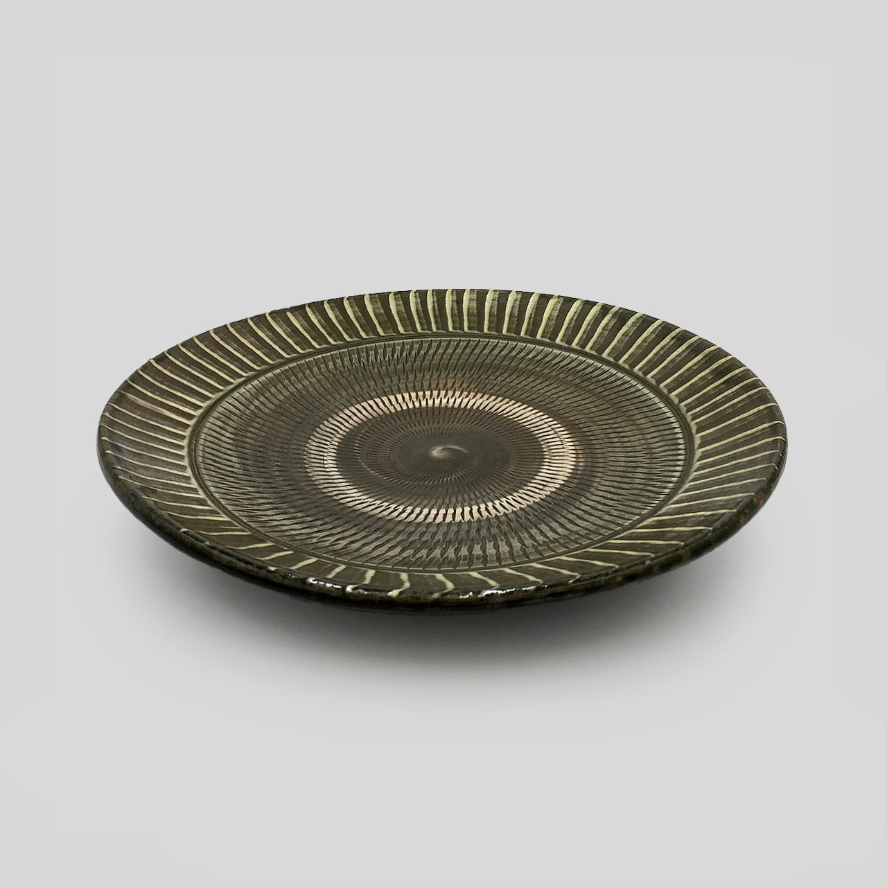 小鹿田焼 小袋窯 9寸皿 打ち刷毛目/飛びかんな 緑 直径約27cm 大皿 陶器 和食器 民藝