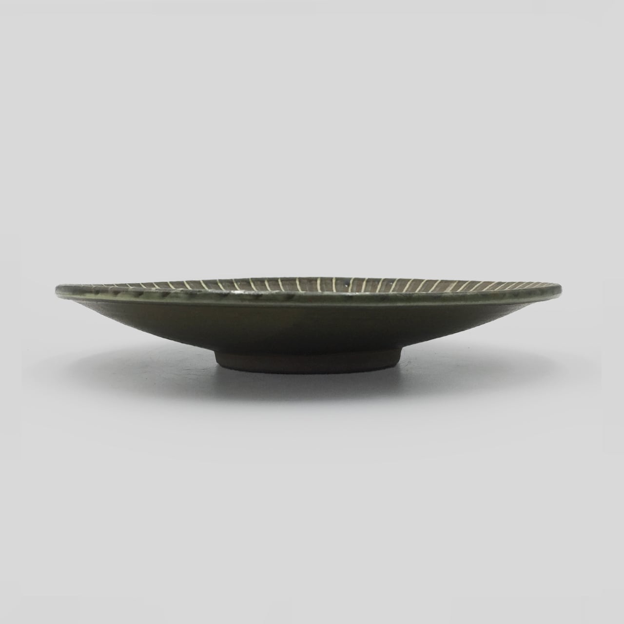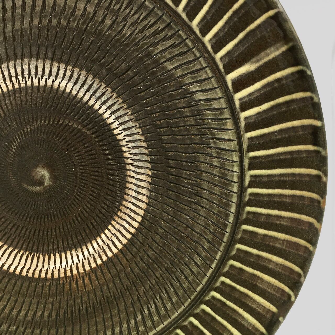 器の内側に小鹿田焼の伝統技法である「飛び鉋(かんな)」と「打ち刷毛目(はけめ)」を施しています。飛び鉋は、弾力性のある金属で作った鉋を使用し、細かい連続的な削り目をつけ模様をつける技法です。打ち刷毛目は刷毛を使って化粧土をぐるりと塗り、連続的な模様をつける技法です。