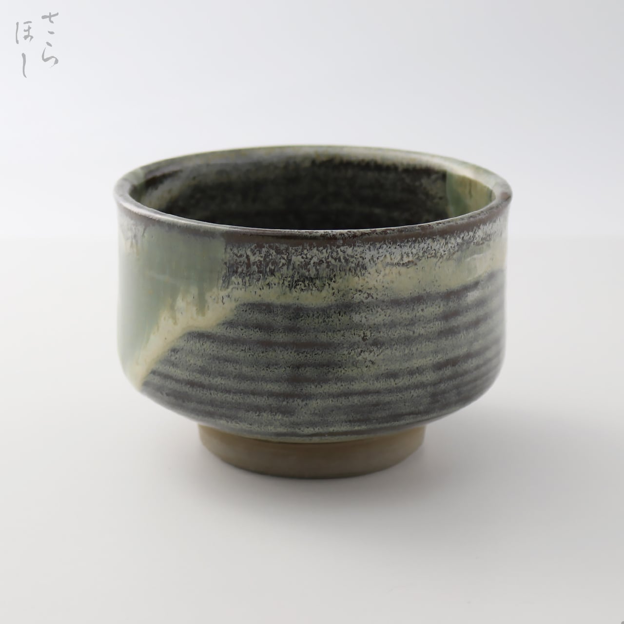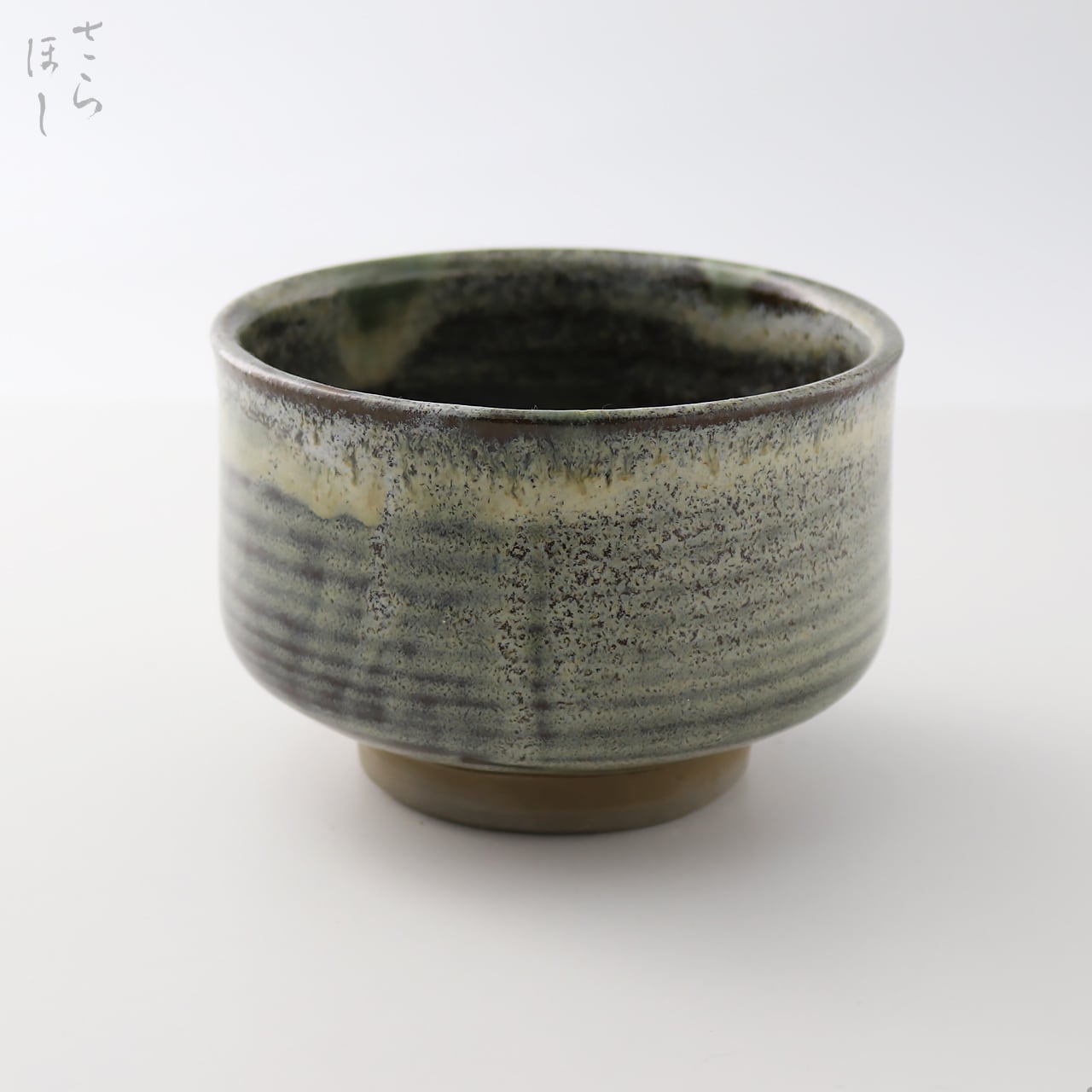 小鹿田焼(おんたやき)の口径約12cmの筒形の少し高さがある抹茶碗(銘:鹿峰) です。