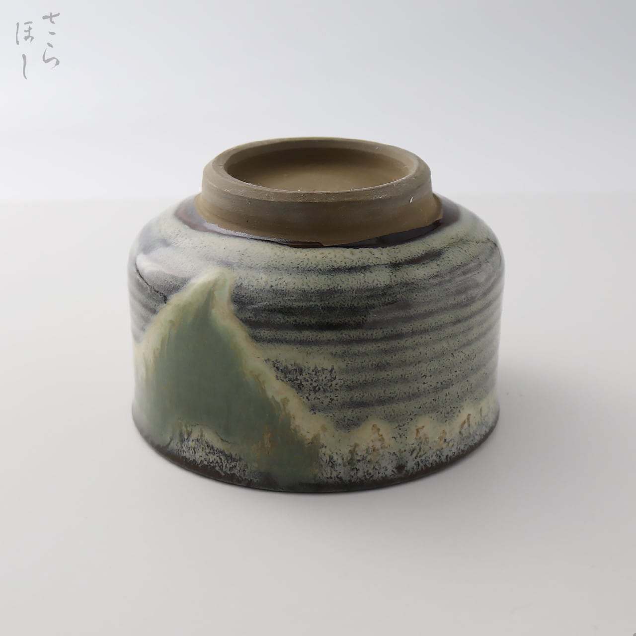 登り窯の炎が溶かした釉薬が器の内外になだれて奥深い表現になっています。静的に重ねられた轆轤目を大胆にグランドキャニオンのようにV字に侵食する釉なだれが見事です。