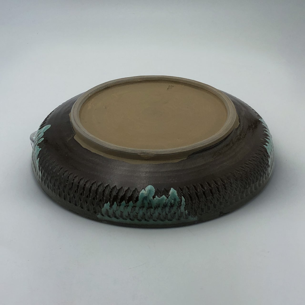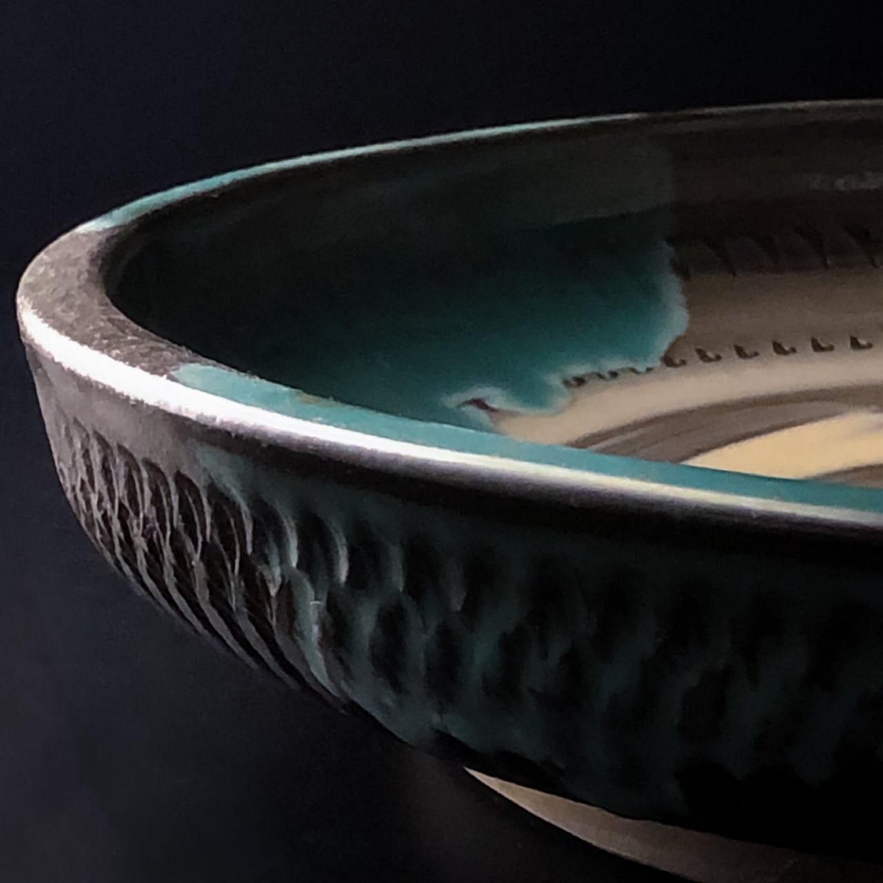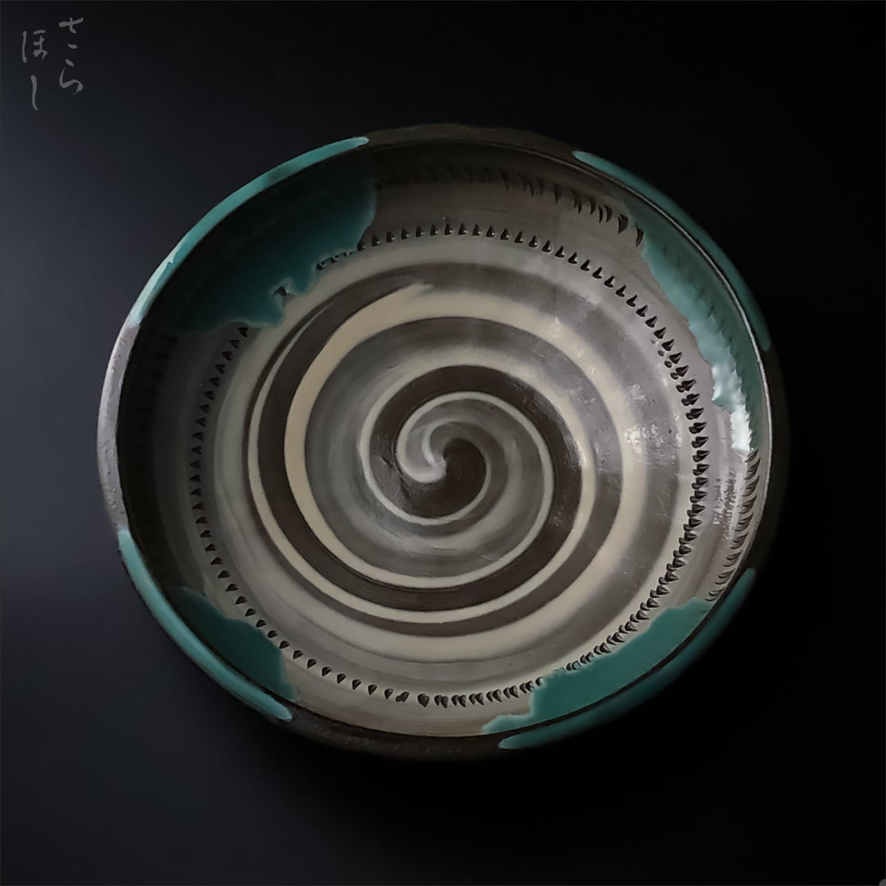 直径が約27.5cmの大皿で、器の内側中央に「指描き」で白化粧土の渦を力強く描き、シンプルな「飛び鉋(かんな)」で囲んでいます。さらに、器の外側に「飛び鉋」を施し、四方から絶妙のバランスで掛けられた青地釉が美しく目を引きます。インテリアのオブジェとして飾っても存在感があります。