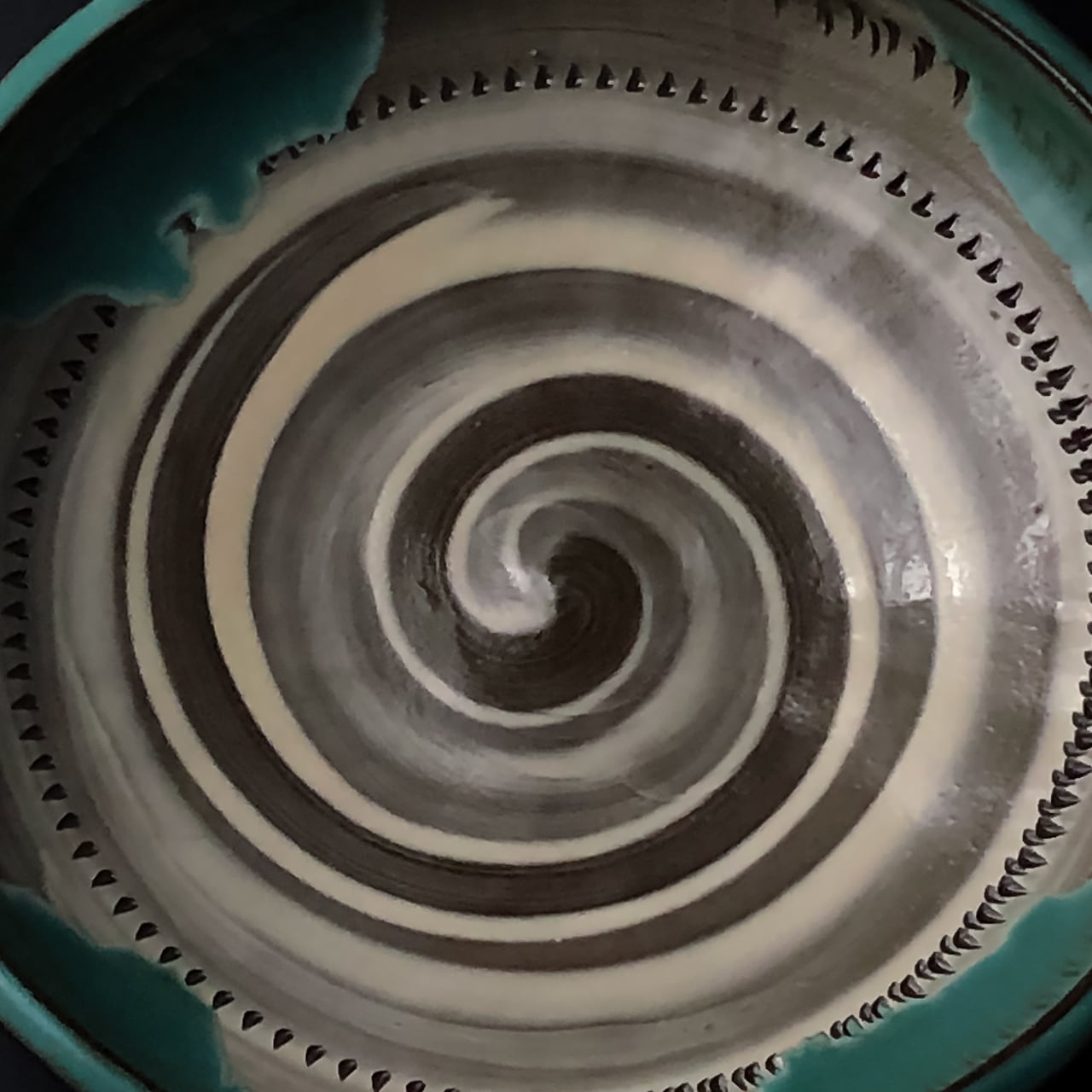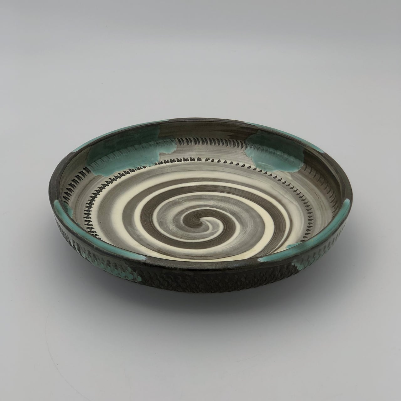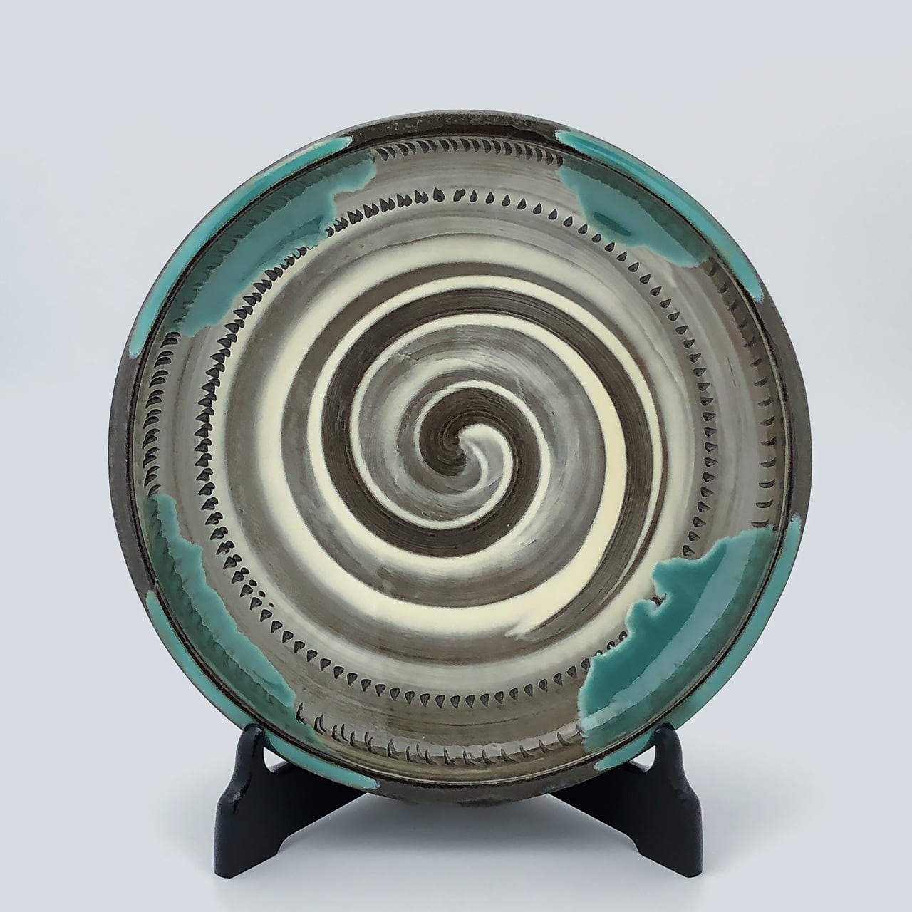 直径が約27.5cmの大皿で、器の内側中央に「指描き」で白化粧土の渦を力強く描き、シンプルな「飛び鉋(かんな)」で囲んでいます。さらに、器の外側に「飛び鉋」を施し、四方から絶妙のバランスで掛けられた青地釉が美しく目を引きます。インテリアのオブジェとして飾っても存在感があります。