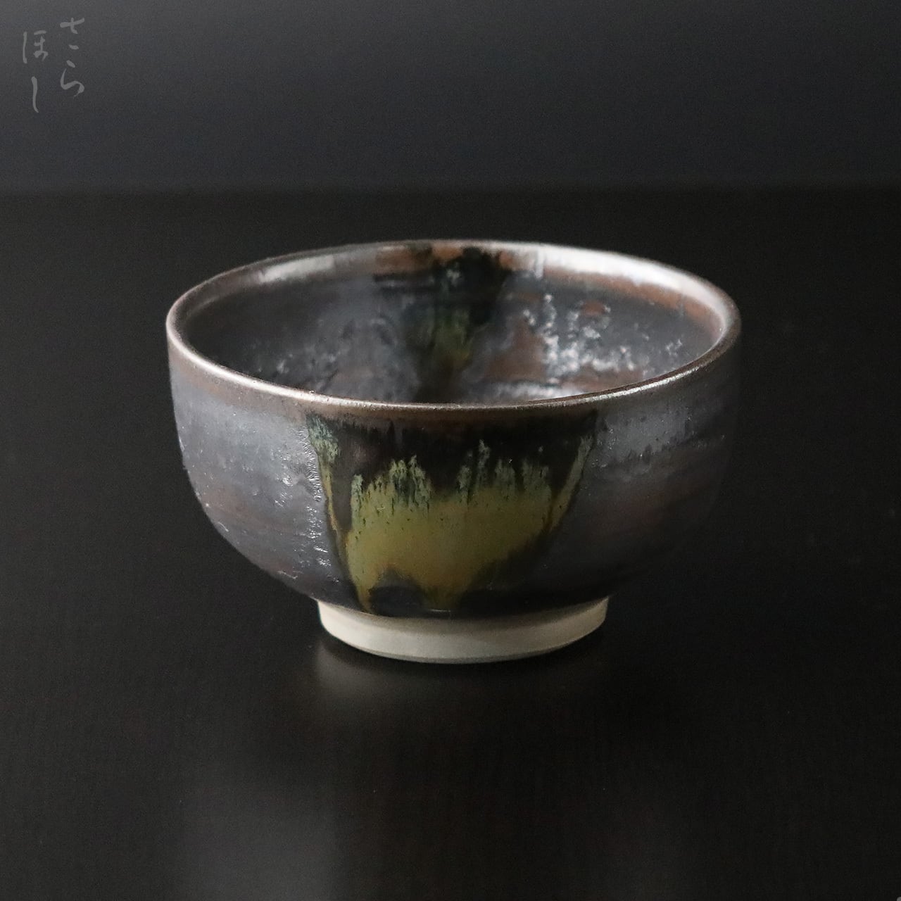 外は滑らかで手に馴染むような肌合いで、内は溶けた釉薬が繊細な表情を見せてくれます。見込みに掛けられた青磁(緑釉)が高温で焼かれてなだれています。描き出した見事な景色です。登り窯の炎が高台部分に小鹿田焼と銘「鹿峰」の判が打ってあります。