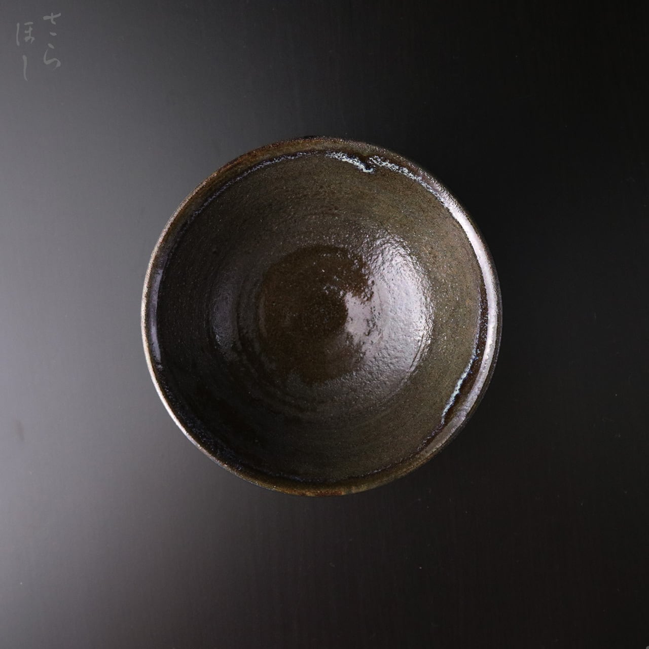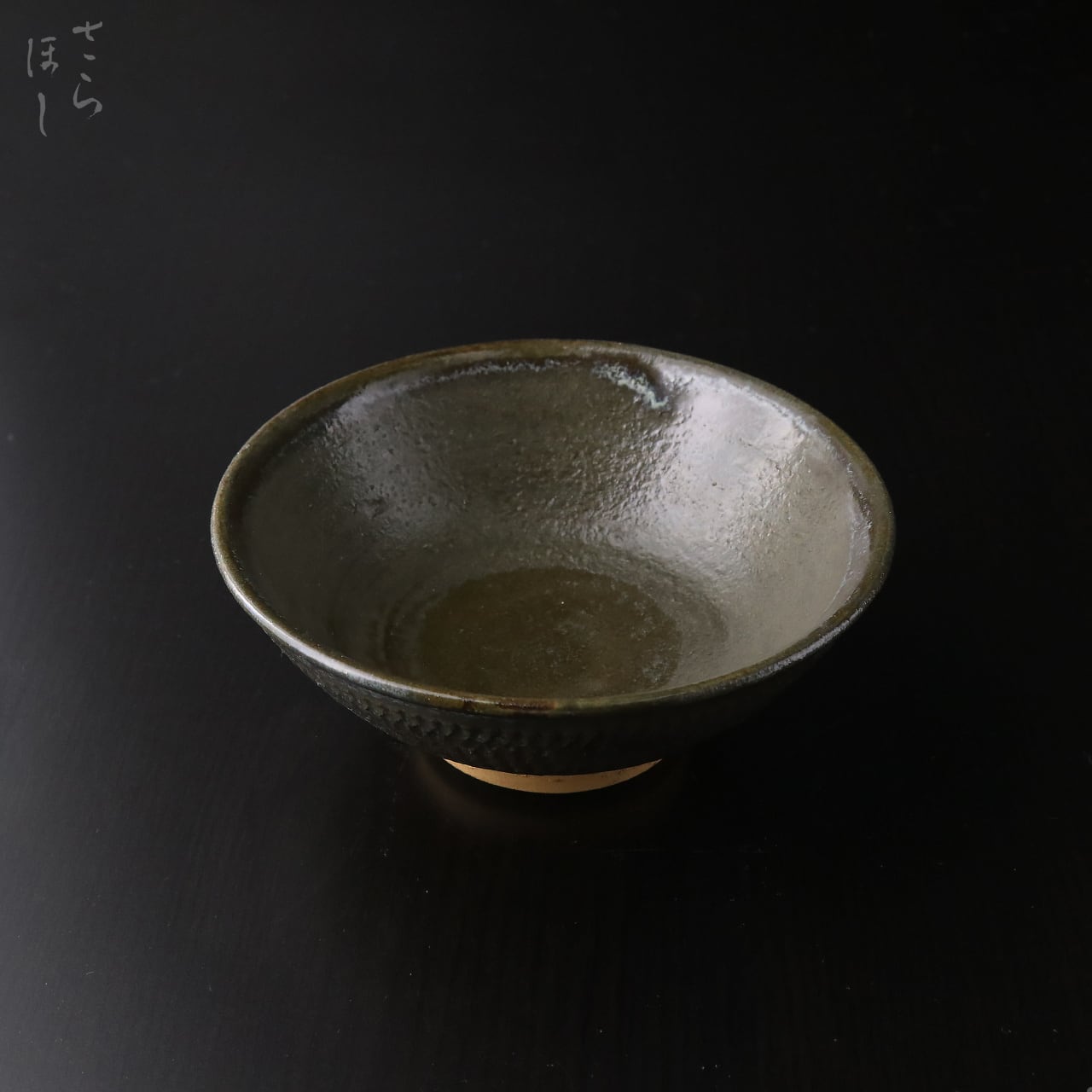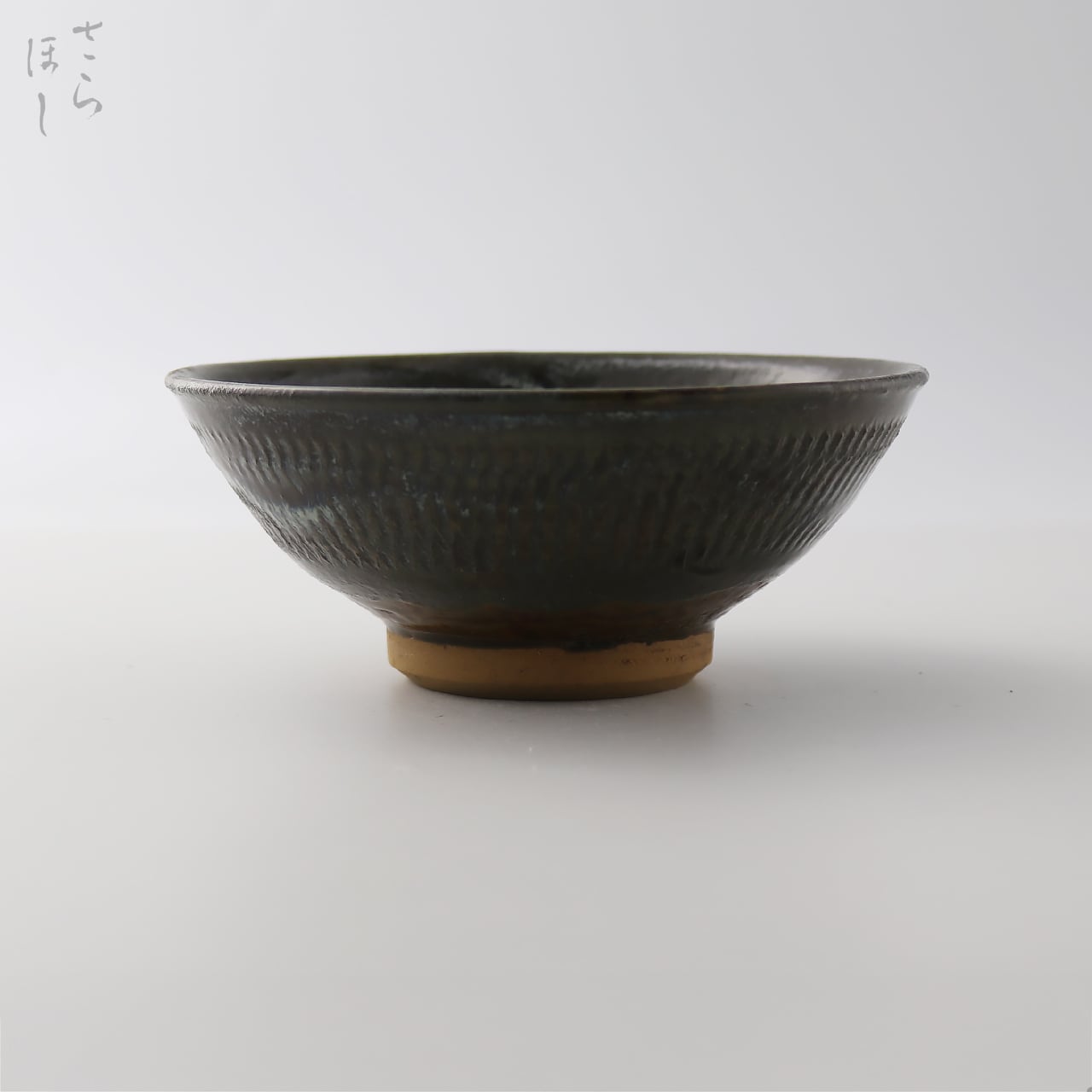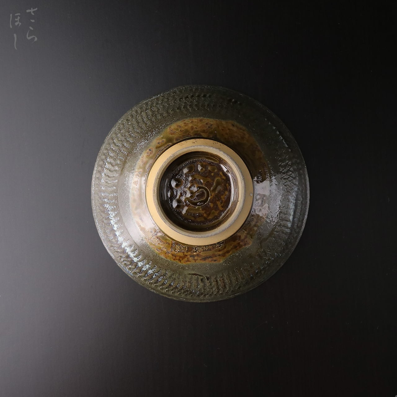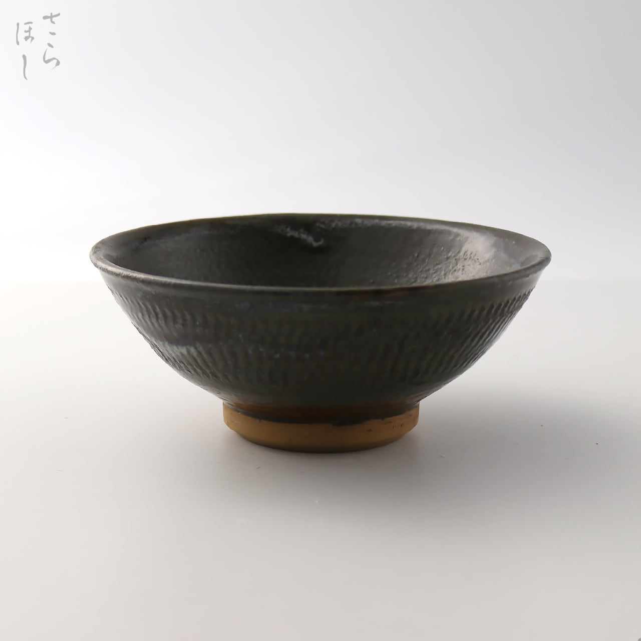 素地の段階で器の外側に小鹿田焼の伝統技法である「飛び鉋(かんな)」を施しています。飛び鉋は、弾力性のある金属で作った鉋を使用し、細かい連続的な削り目をつけ模様をつける技法です。また、内外に溶け残った白釉が薄っすら積もった雪のように見えたり、高台付近にはドウケ釉(伊羅保釉)が掛けられるなど仕掛けがしてあります。高級な飯碗としてもおすすめです。